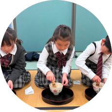 1・2年を必須とし、裏千家教授を初めとする講師3名が対応します。茶道は、お茶を通して「おもてなしの心」を育む文化です。季節のお花や掛け軸から四季の移ろいを感じながら相手を思いやる気持ちを育てます。