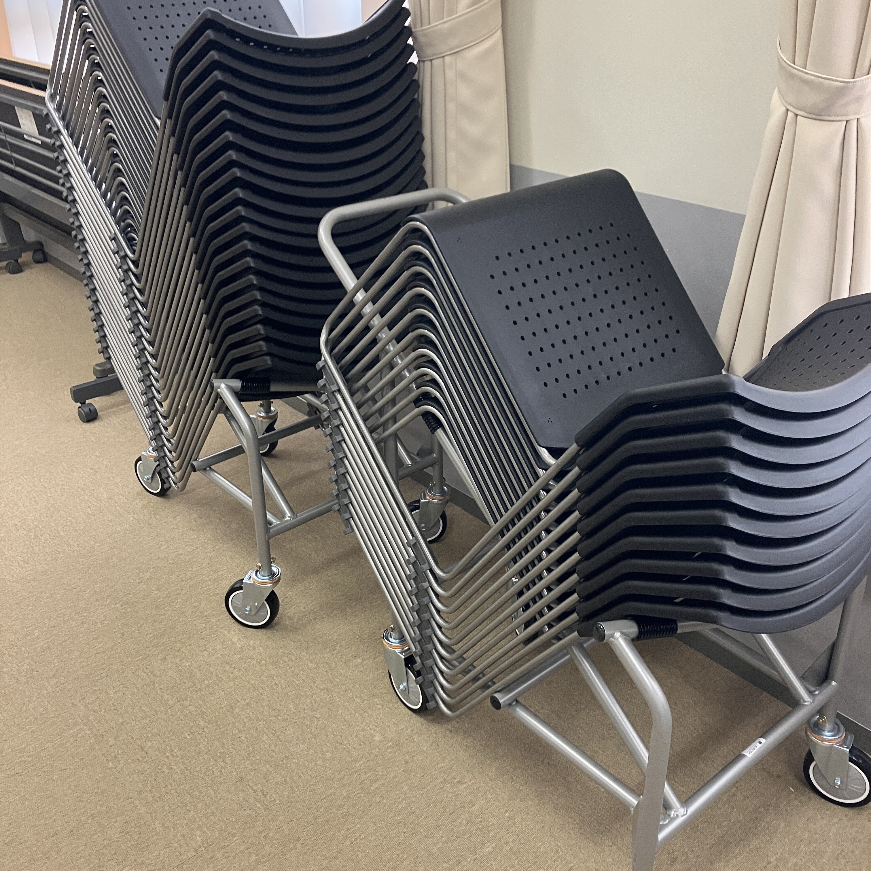 大量の椅子を効率的に管理できる専用の台車も併せて寄贈いただきました。