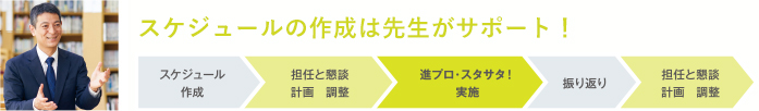 「進プロ」「スタサタ!」ともに、生徒は担任と懇談しながら、スケジュールを作成します。担任が常にチェック・アドバイスを行い、生徒のセルフデザインをサポートします。