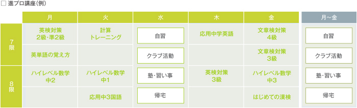 中学1年生から高校卒業まで実施される大学進学プログラムです。放課後や長期休暇を利用して、基礎学力の徹底と各種検定へのチャレンジを中心に行われます。中学卒業時に準2級合格を目指す「英検対策」は級別講座・面接指導を開講。各自の到達度に合わせた講座を受講できます。