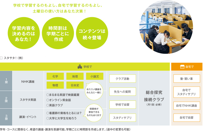家で勉強するのも良し。でも学校で勉強するとやっぱり楽しい!NHK講座、オンライン英会話など、コンテンツは様々。土曜日はさまざまな講座やイベントを開催し、やる気アップにつなげます。クラブ活動や自習、先生への質問・相談もできます。