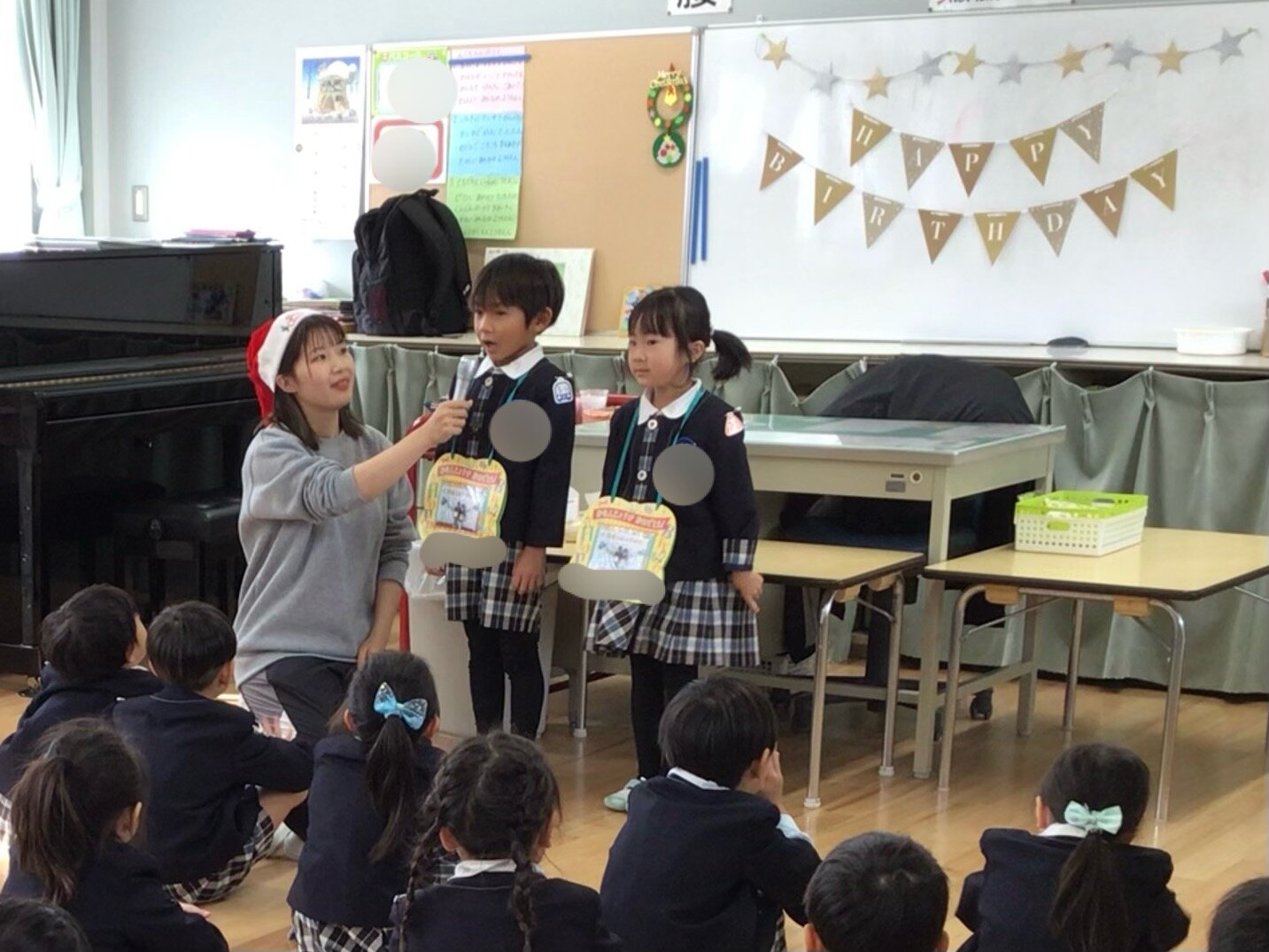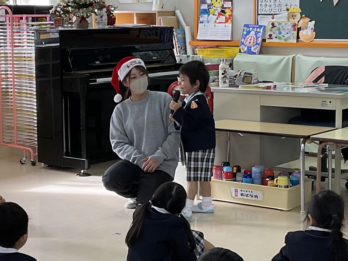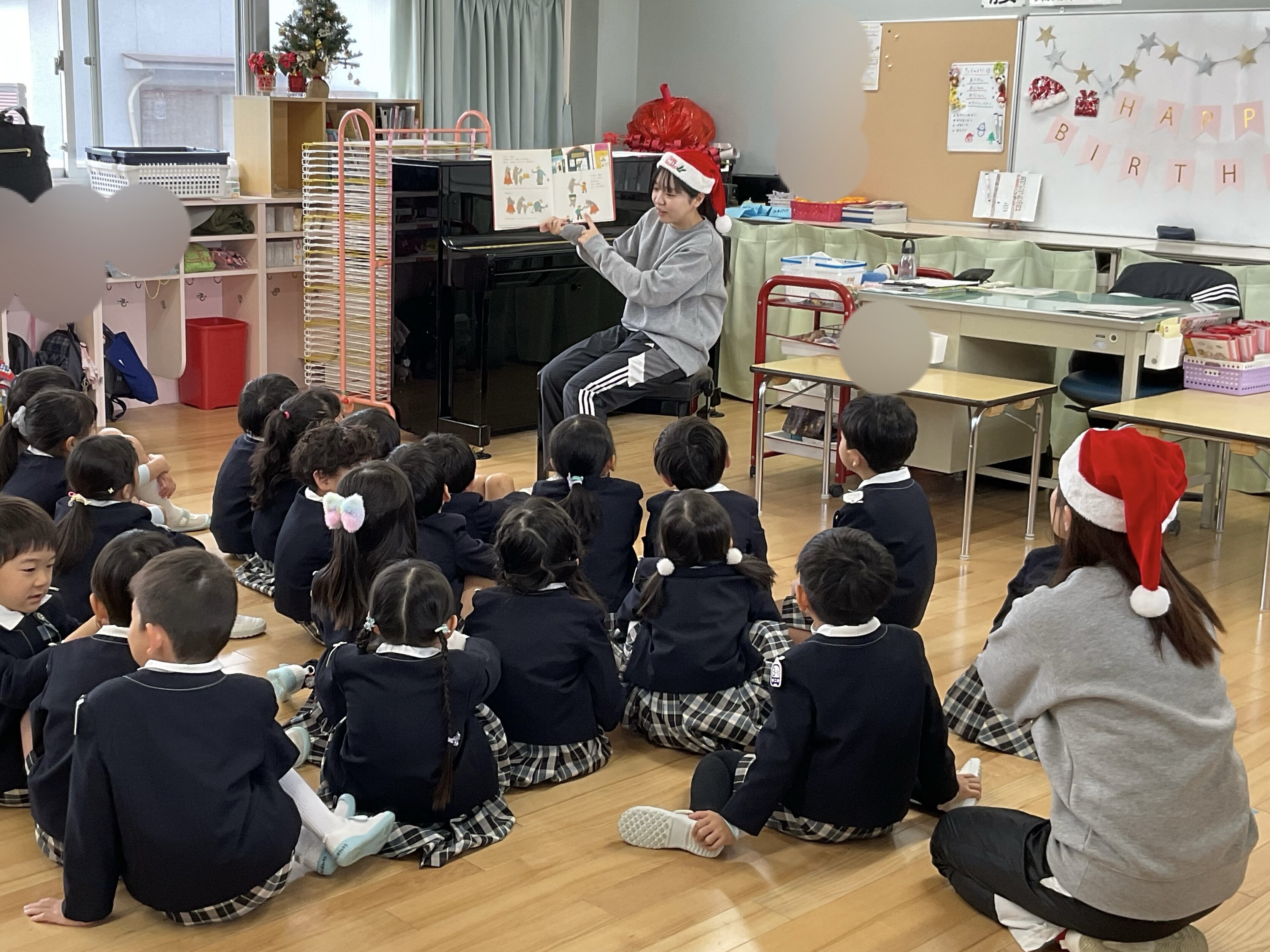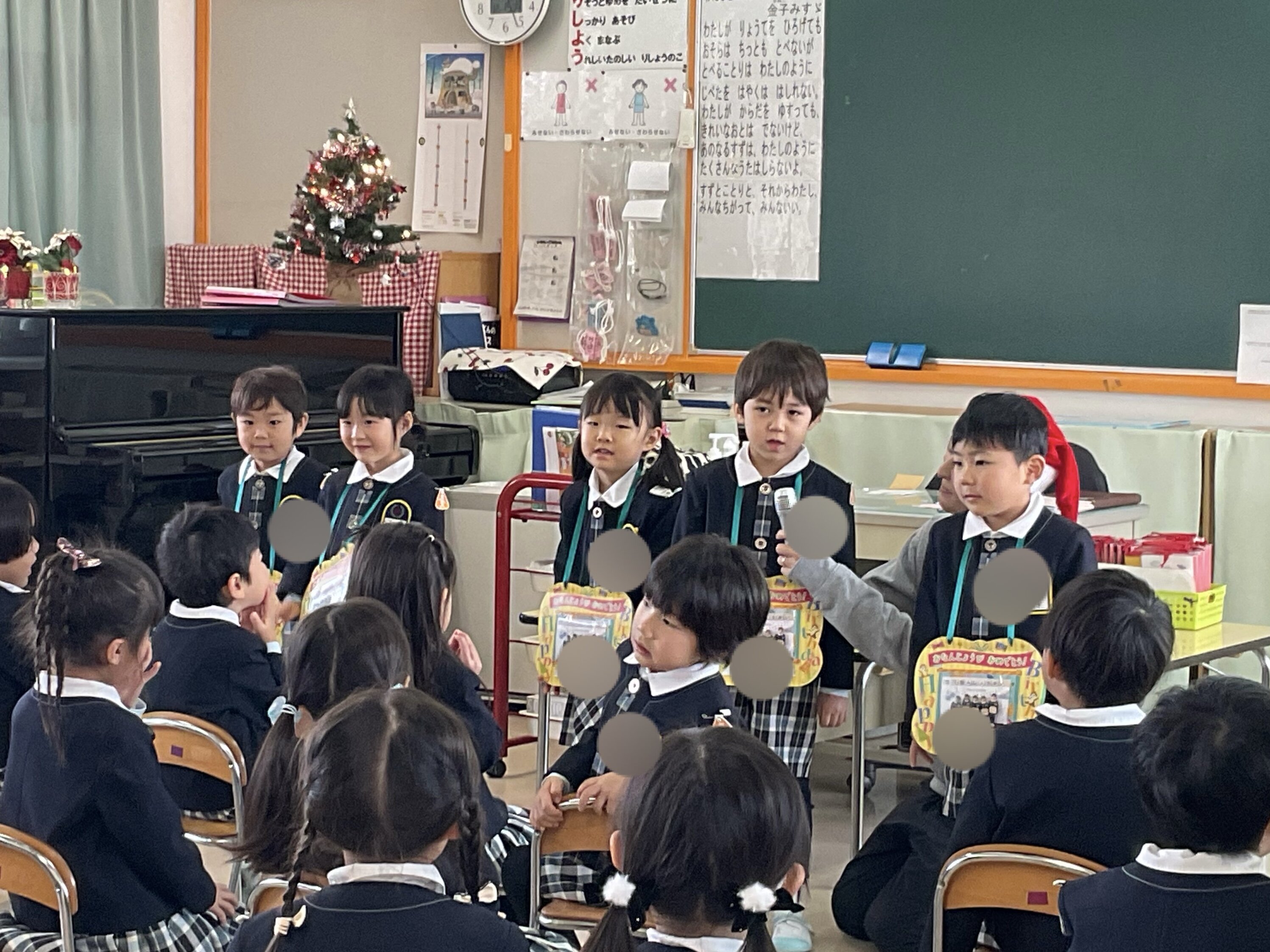 りしょうキッズだより ☆12/15 12月誕生会&お楽しみ会☆ 12月のお友だちの誕生会がありました! ドキドキしながらも一生懸命 前で発表してくれた12月生まれのお友だち^ ^ みんなからは「おめでとうおたんじょうび」のお歌をプレゼント♪ 12月生まれのお友だちおめでとう(*^^*) 素敵な一年になりますように☆ 誕生会が終わった後は 幼稚園にサンタさんが来てくれました♪ 「プレゼントは○○が欲しいの!」 「お家にも来てね♪」とみんな思い思いにお話をして ハイタッチをしてもらいました! もうすぐクリスマス! みなさん素敵なクリスマスをお過ごしください♪♪ りしょうキッズだより一覧へ