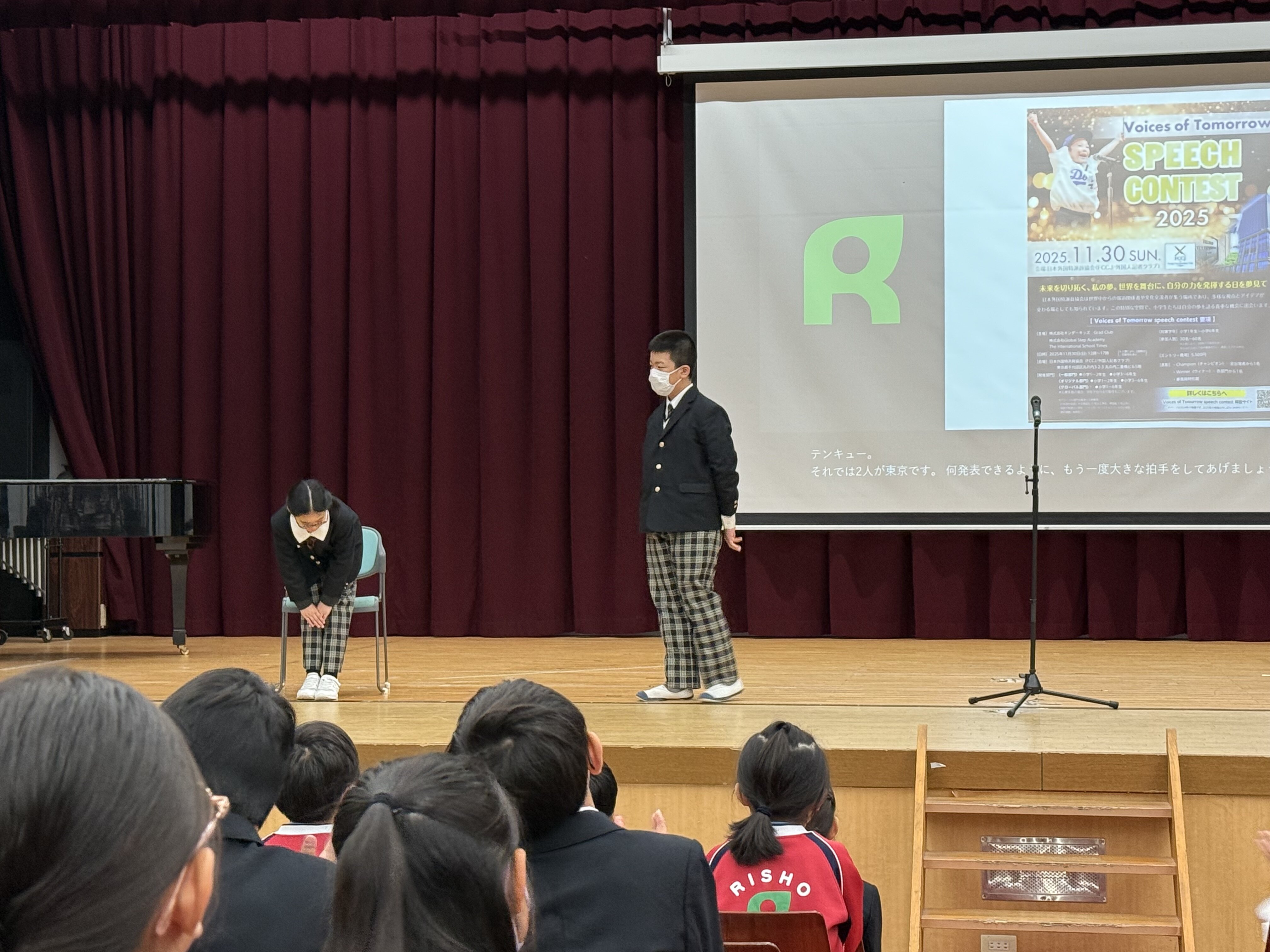 2025/11/18 全学年 英語教育 スピーチコンテストに向けて全校朝礼で発表!! 11月18日(火) 全校朝礼 校長先生からは、「挑戦」に関するお話がありました。 そして、11月30日(日)東京の日本外国特派員協会で開催される『スピーチコンテスト』に出場する学校代表の2名が全校児童の前で練習の成果を発表しました。2名とも何度も発音を注意され練習してきました。今日の発表では本当に堂々とした姿で全校児童を魅了しました。あと10日ほどで本番です。最後まで気を抜かず練習を続けていきましょうね。当日が楽しみです。 <Instagramはコチラ>