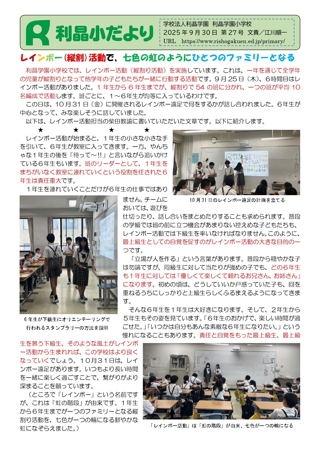 利晶小だより 27号 『レインボー(縦割り)活動で、七色の虹のようにひとつのファミリーとなる』
