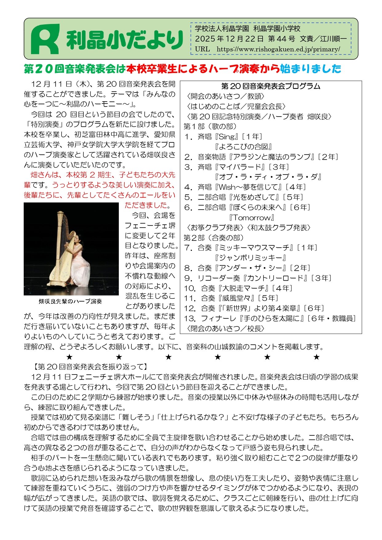 利晶小だより 44号 『第20回音楽発表会は本校卒業生によるハープ演奏から始まりました』