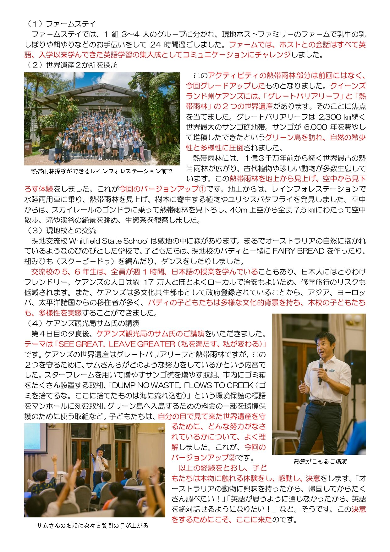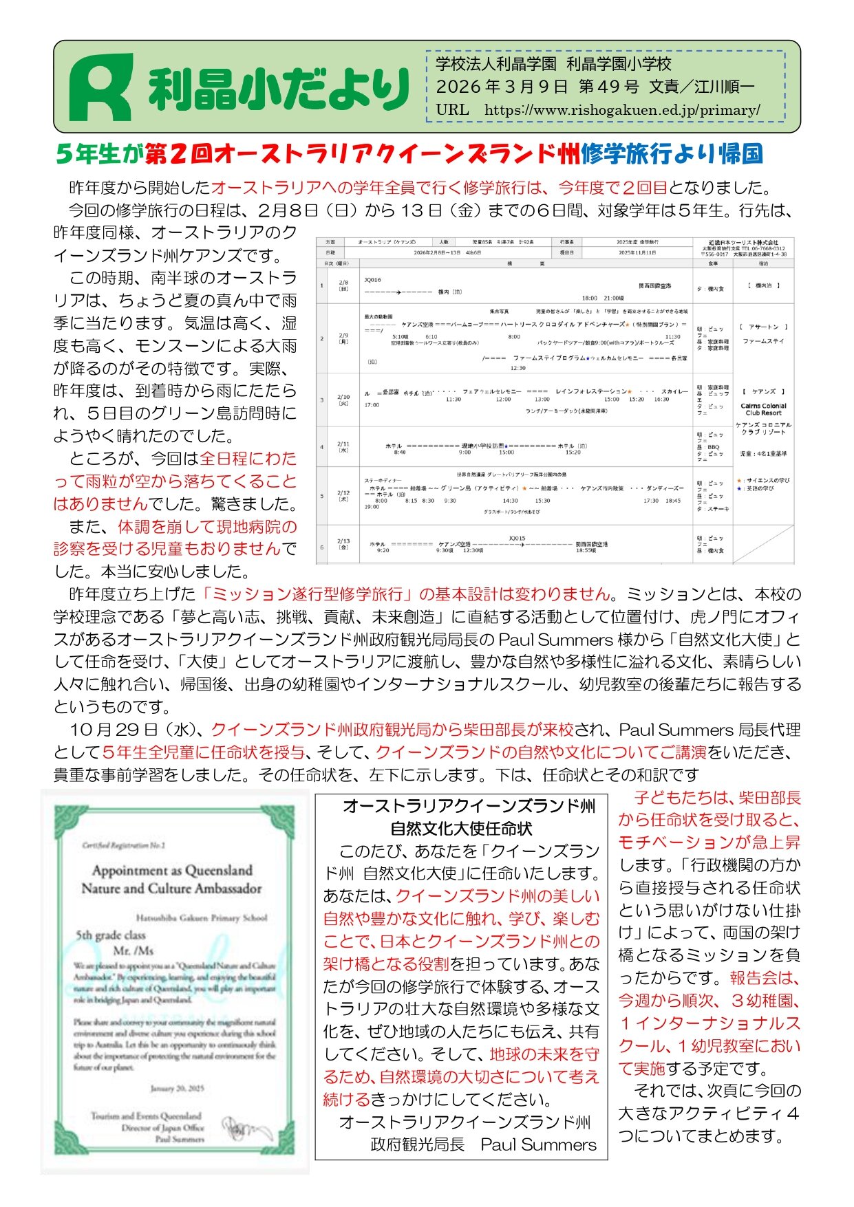 利晶小だより 49号 『5年生が第2回オーストラリアクイーンズランド州修学旅行より帰国』