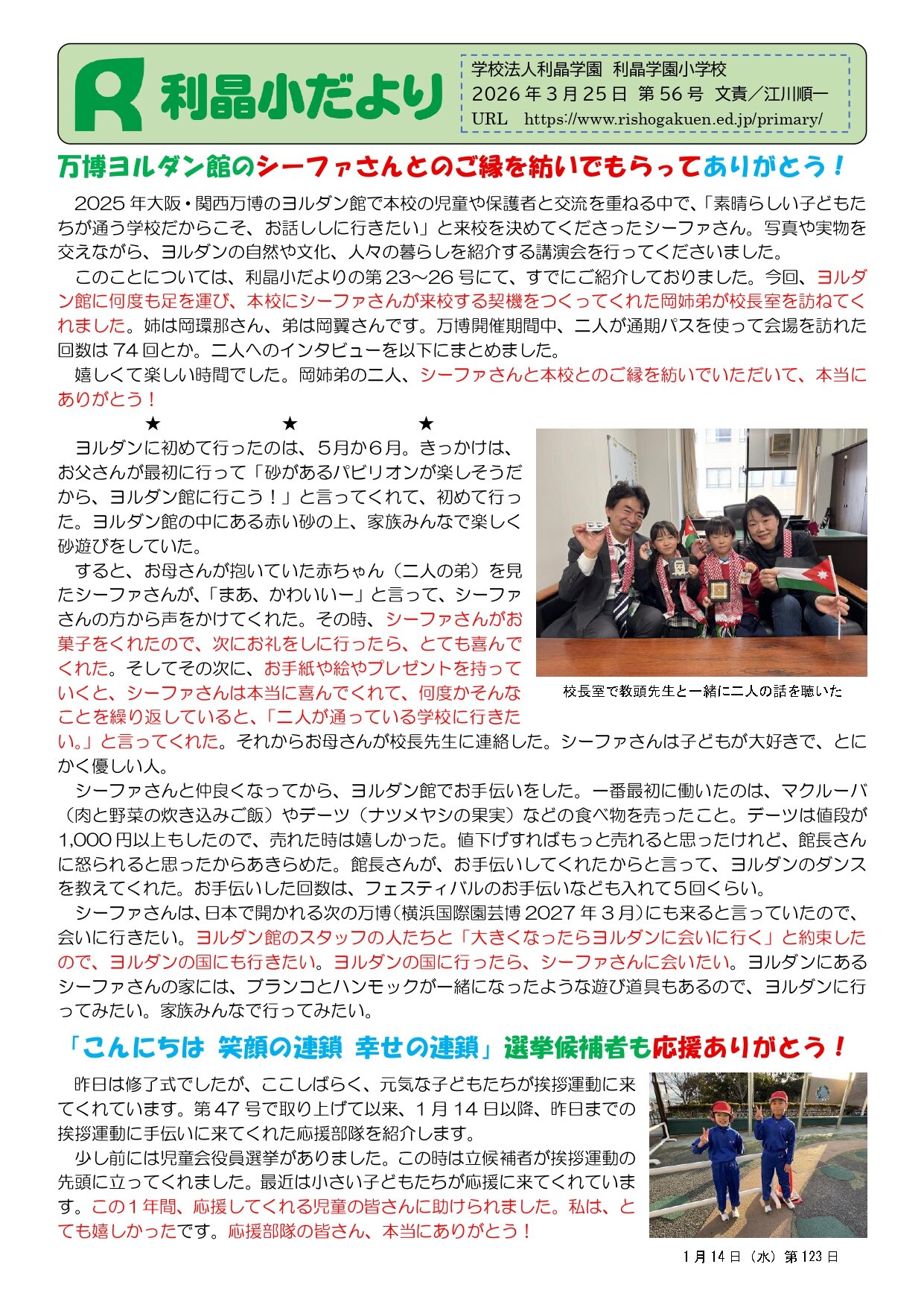利晶小だより 56号 『万博ヨルダン館のシーファさんとのご縁を紡いでもらってありがとう!』
