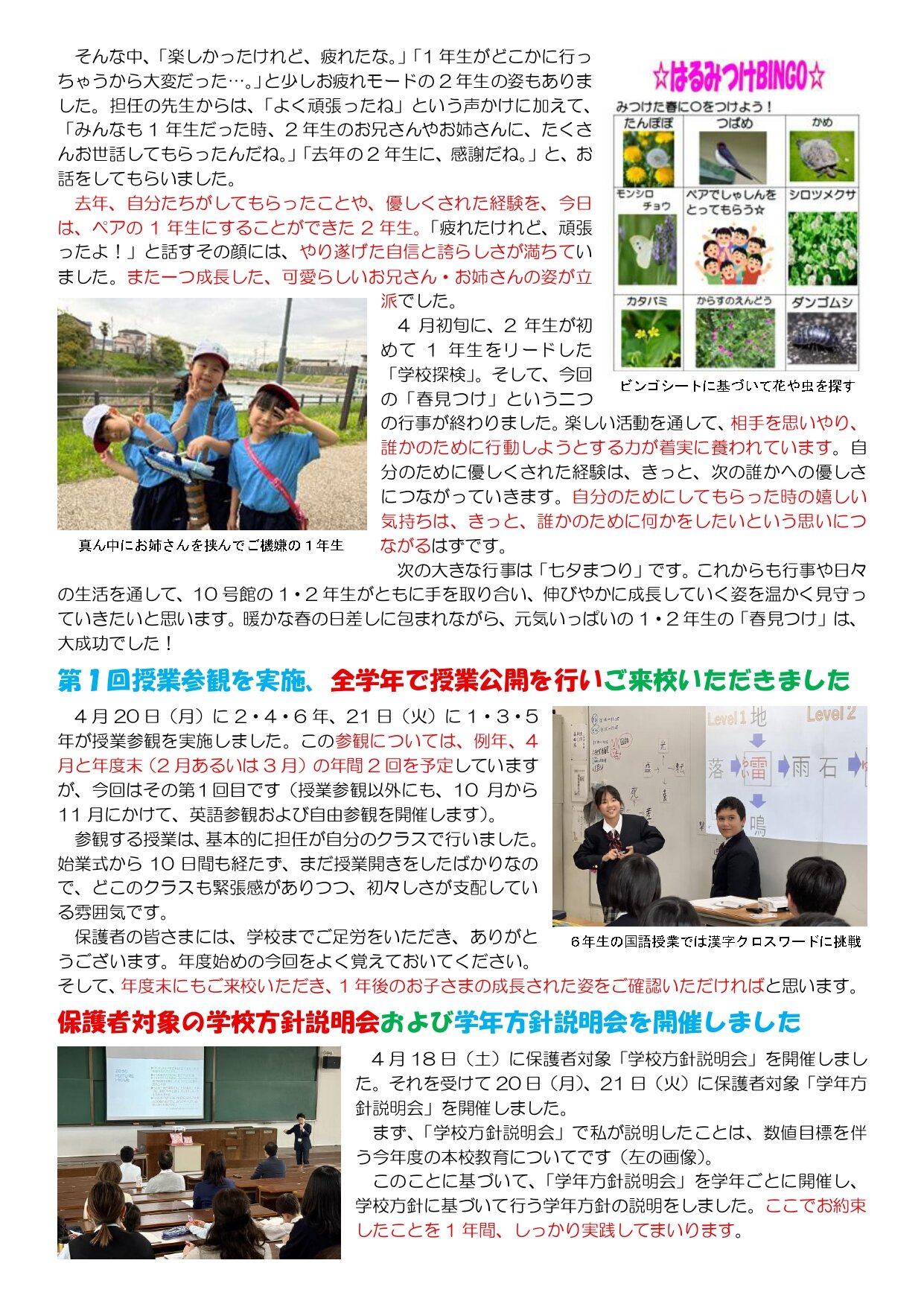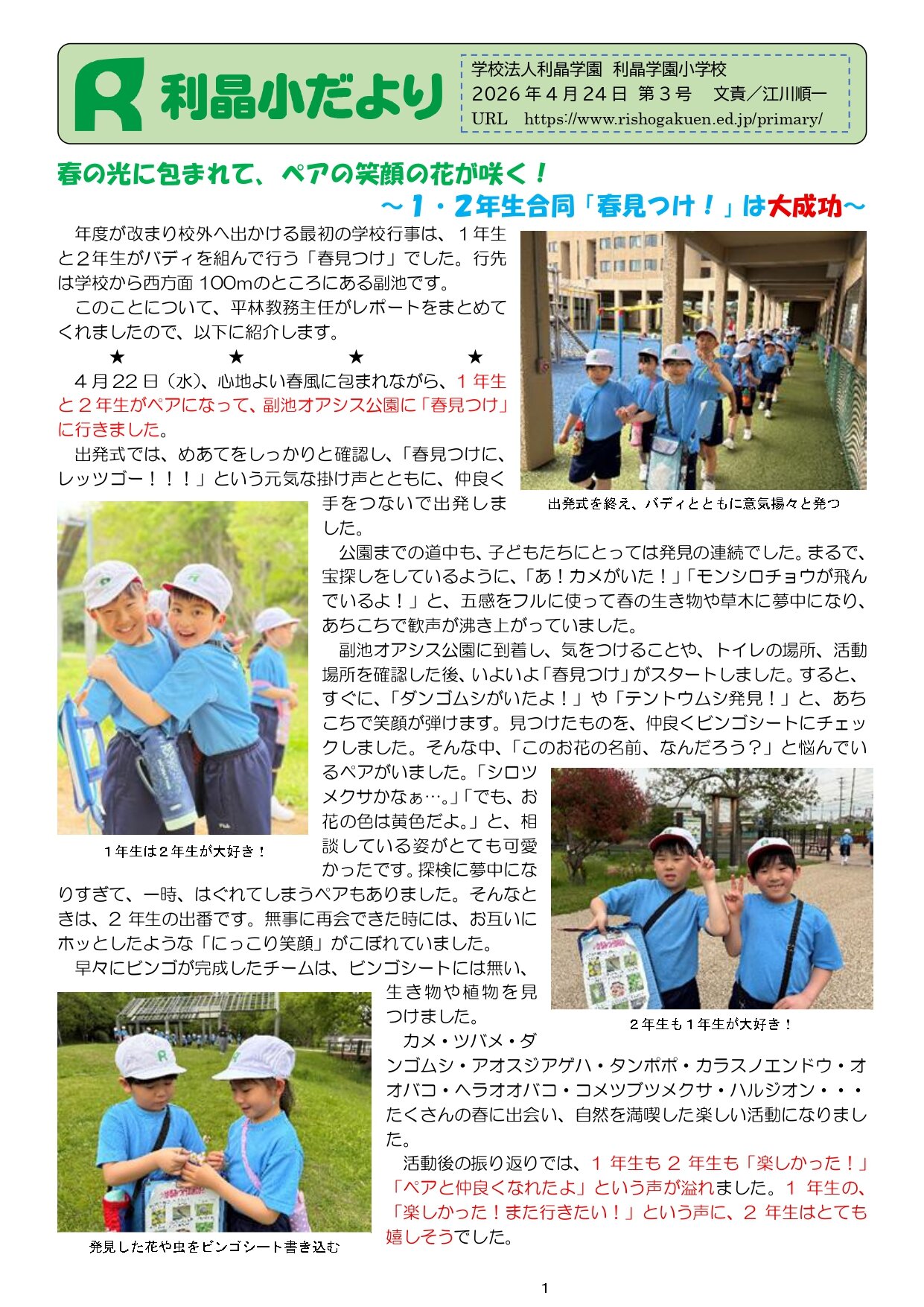 利晶小だより 3号 『春の光に包まれて、ペアの笑顔の花が咲く!~1・2年生合同「春見つけ!」は大成功~』