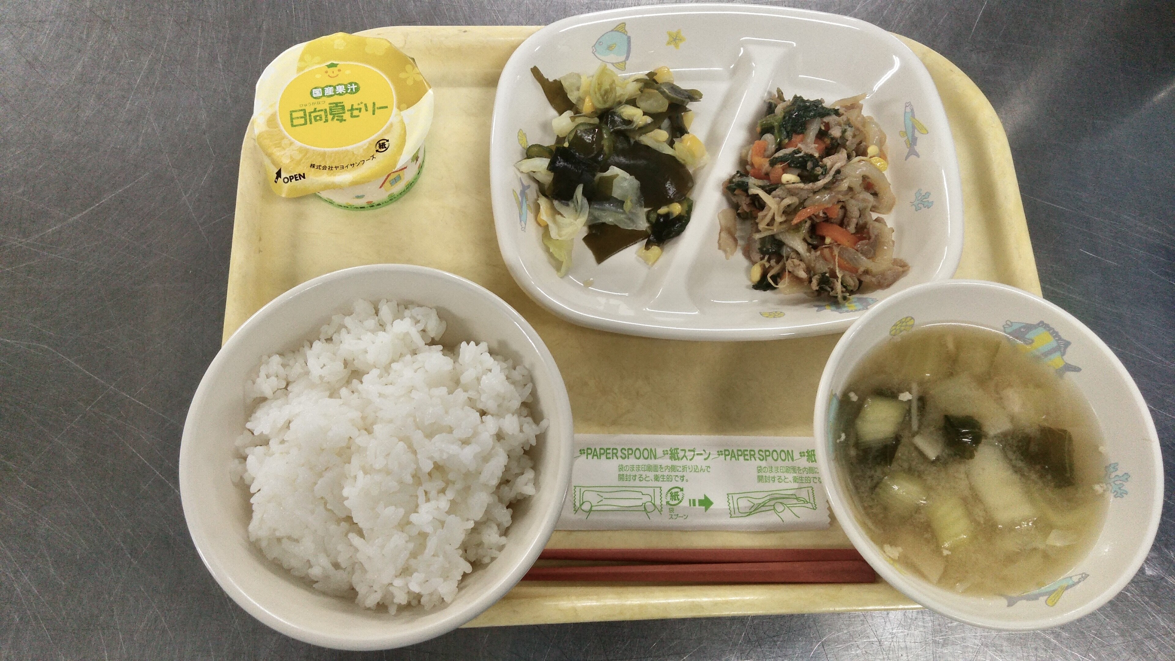 『ご飯』『ビビンバ丼(風)』『キャベツとワカメのさっぱりサラダ』『みそスープ』『日向夏ゼリー』