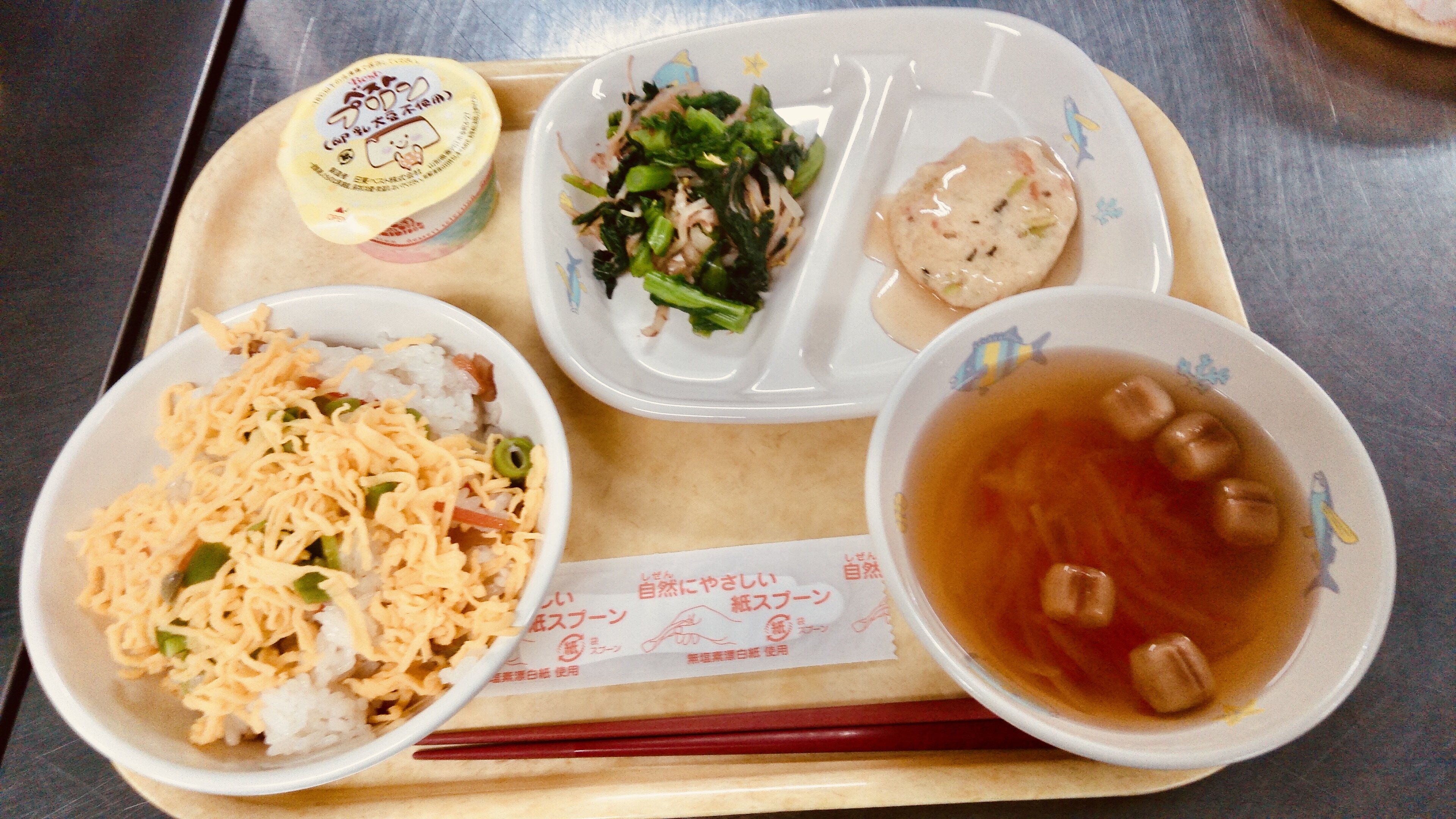 『ちらし寿司』『豆腐ハンバーグ和風あん』『菜の花和え』『すまし汁(ひなまつり)』『プリン(卵乳大豆不使用)』