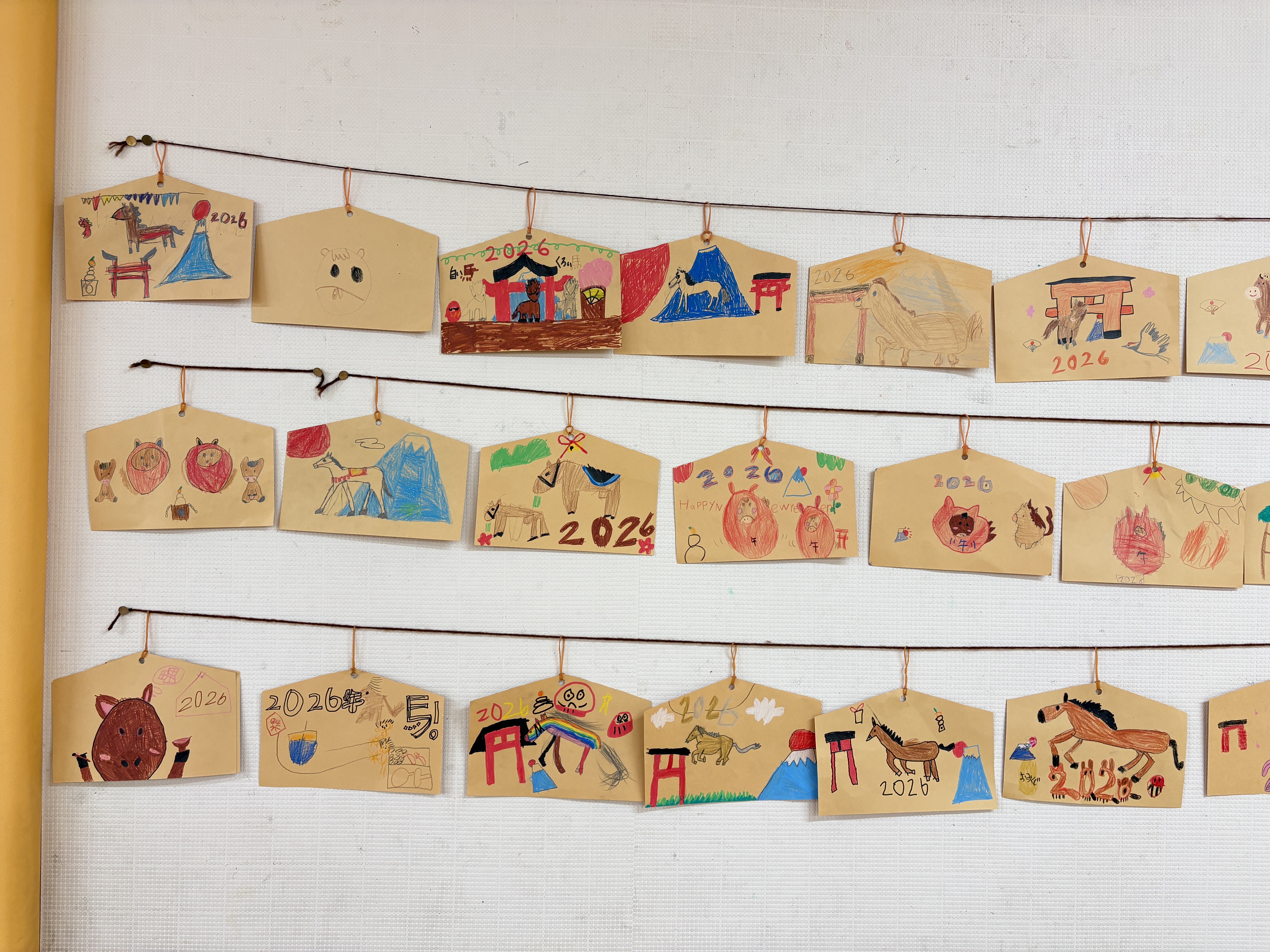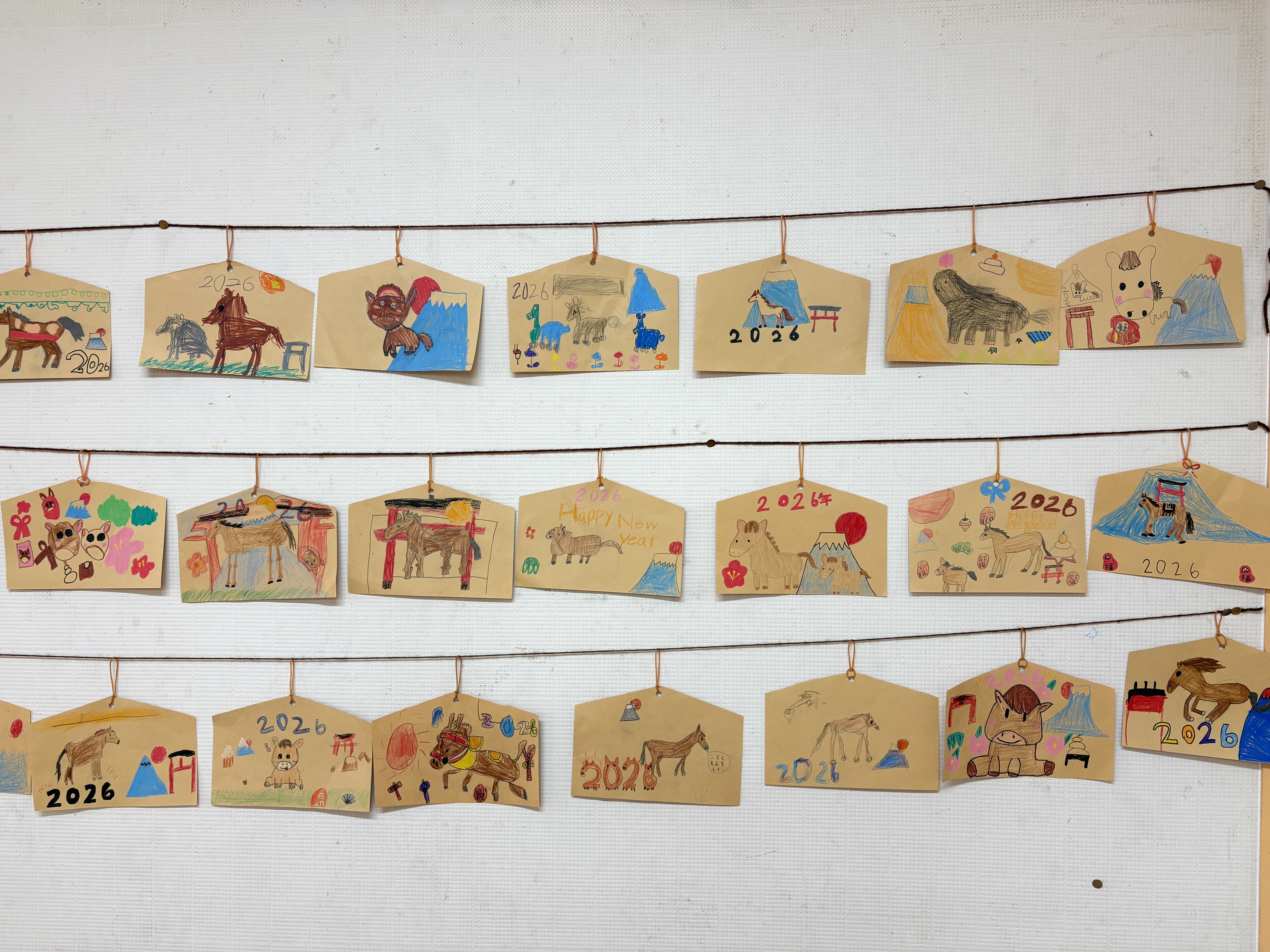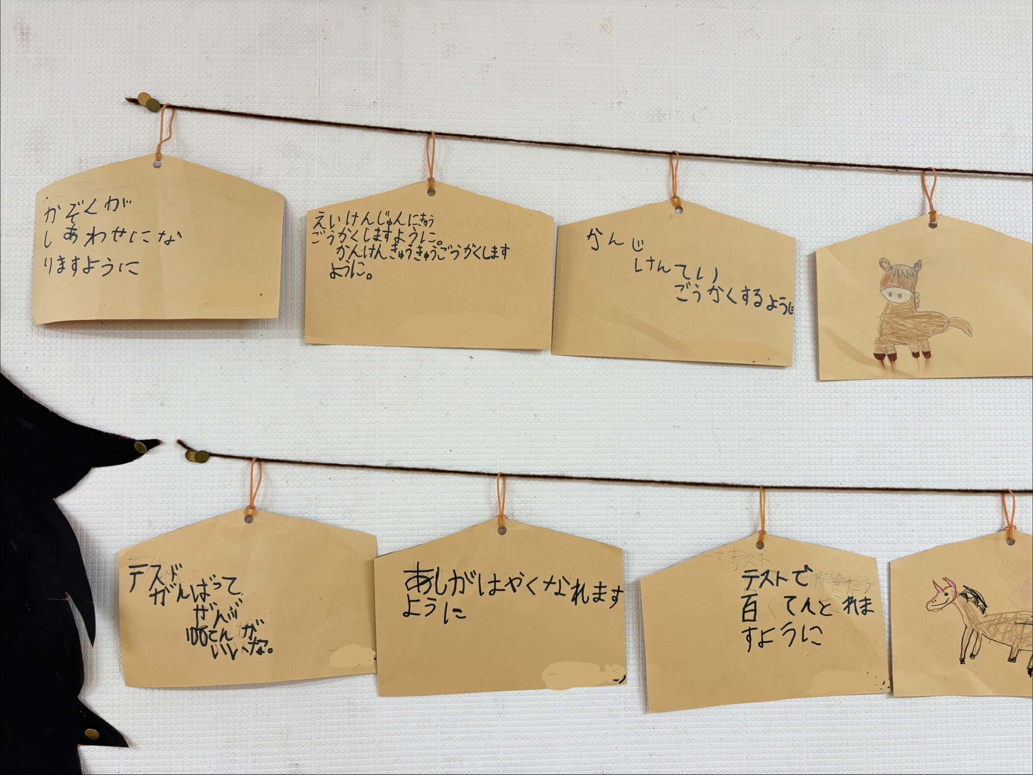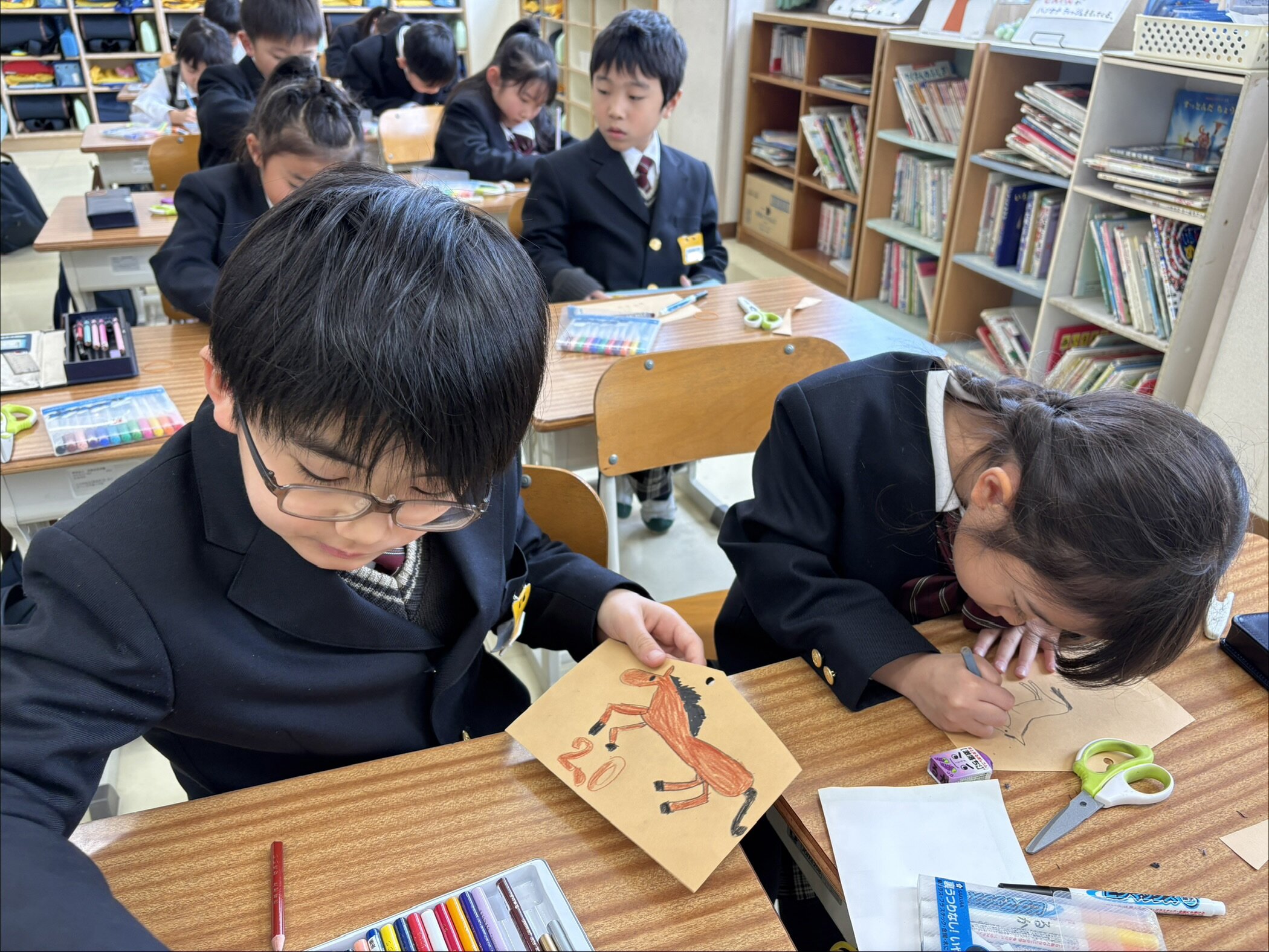 2026/01/091年 3学期スタート〈1年生〉 あけましておめでとうございます。 3学期が始まり、子どもたちの元気な声が教室に戻ってきました。 1年の始まりということで、絵馬づくりを行いました。 まずは、2026年に頑張りたいことや叶えたいことを書きました。 「漢検に合格する」「早寝早起きをする」など、それぞれが自分の目標を考え、丁寧に書くことができていました。 その後は、今年の干支である「馬」の絵を描きました。 かっこいい馬やかわいい馬など、一人一人が工夫して上手に描くことができました。 みんなの願い、叶うといいな!