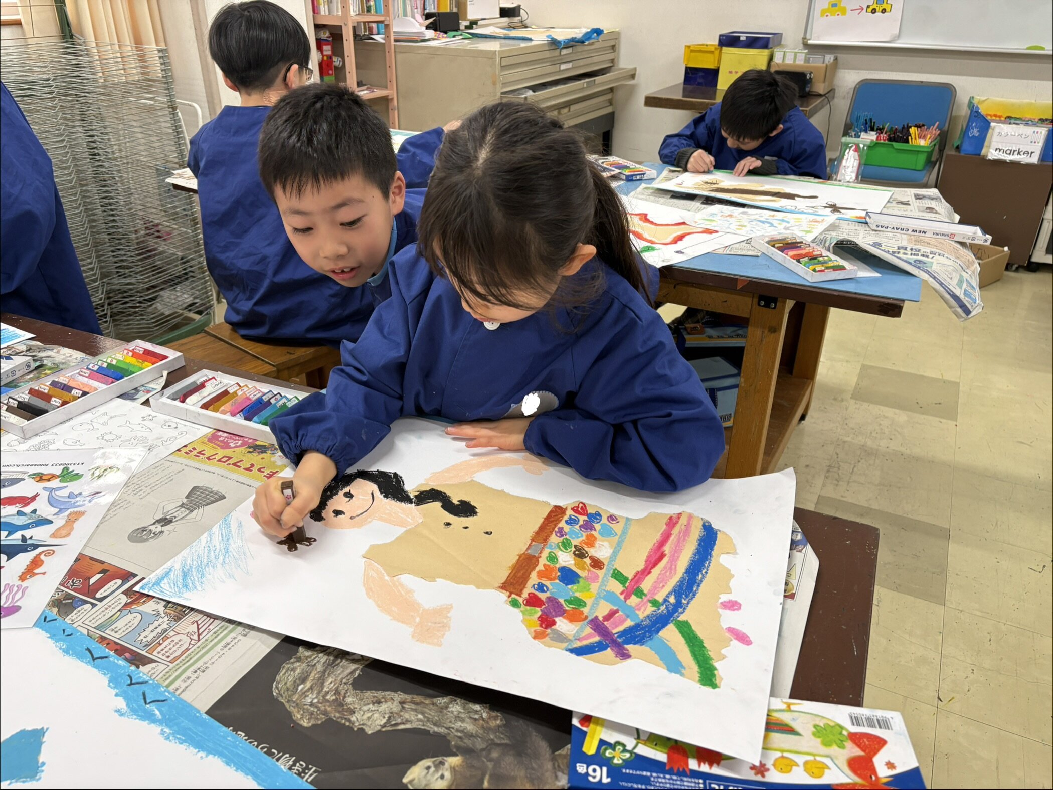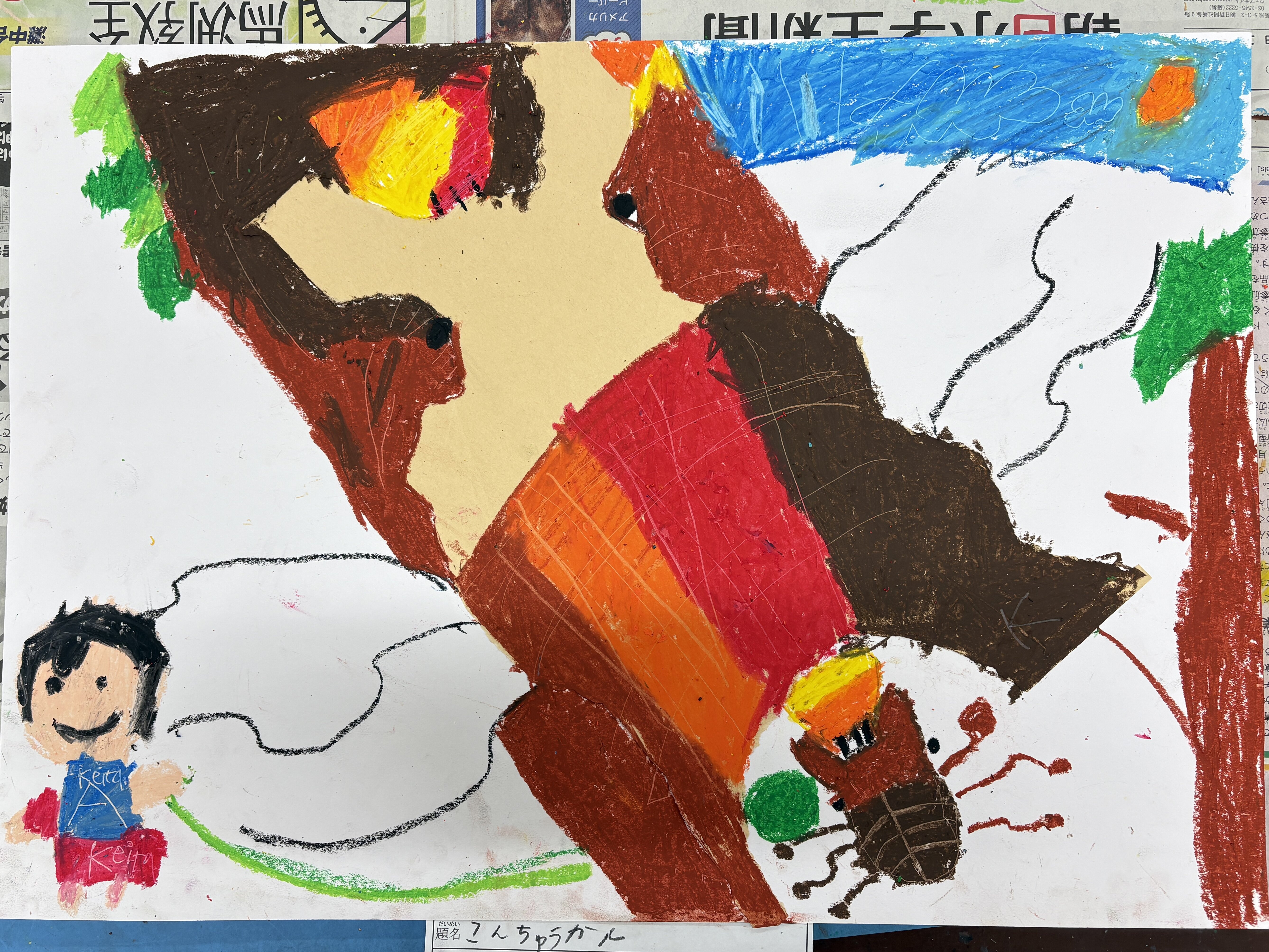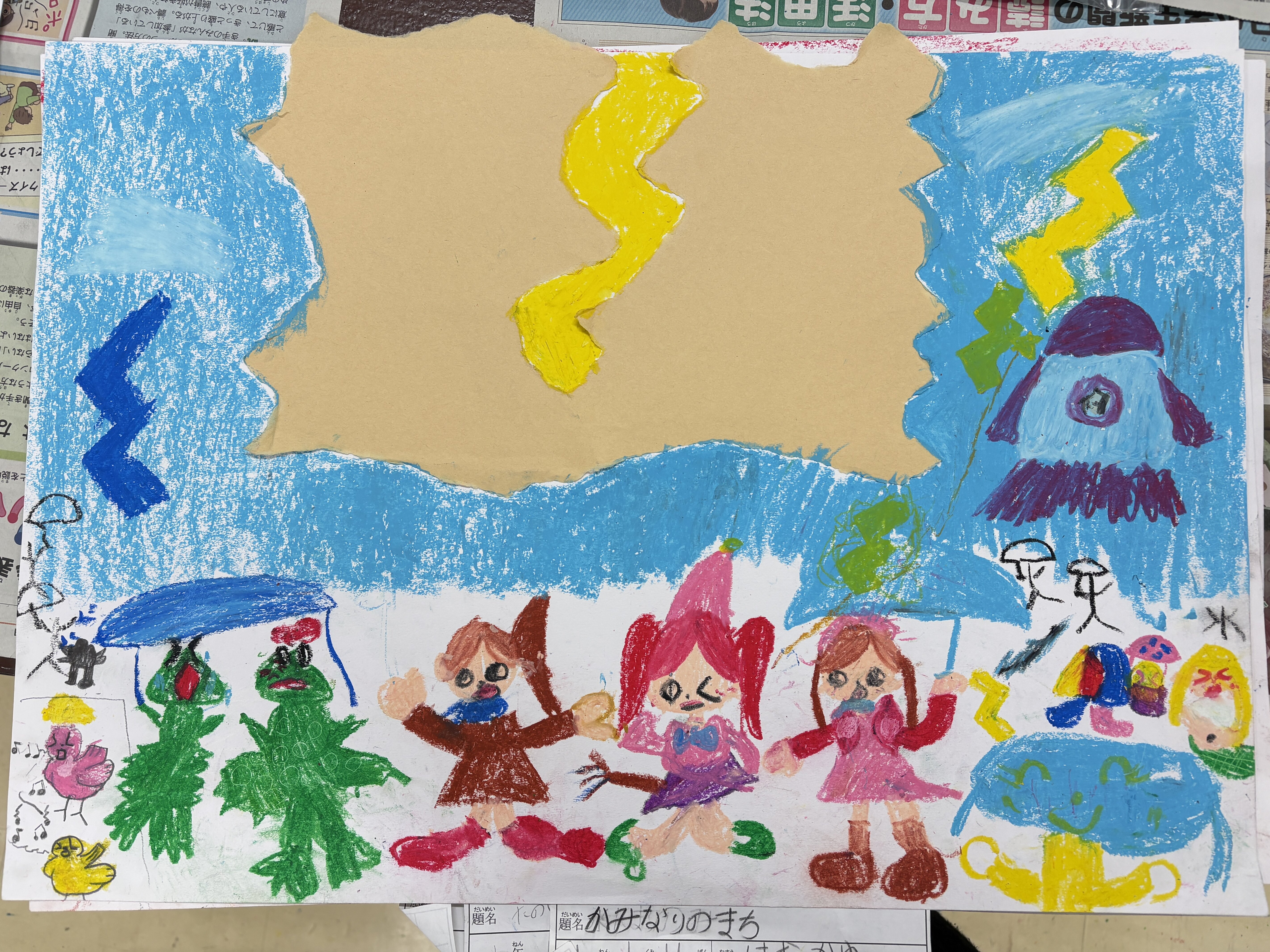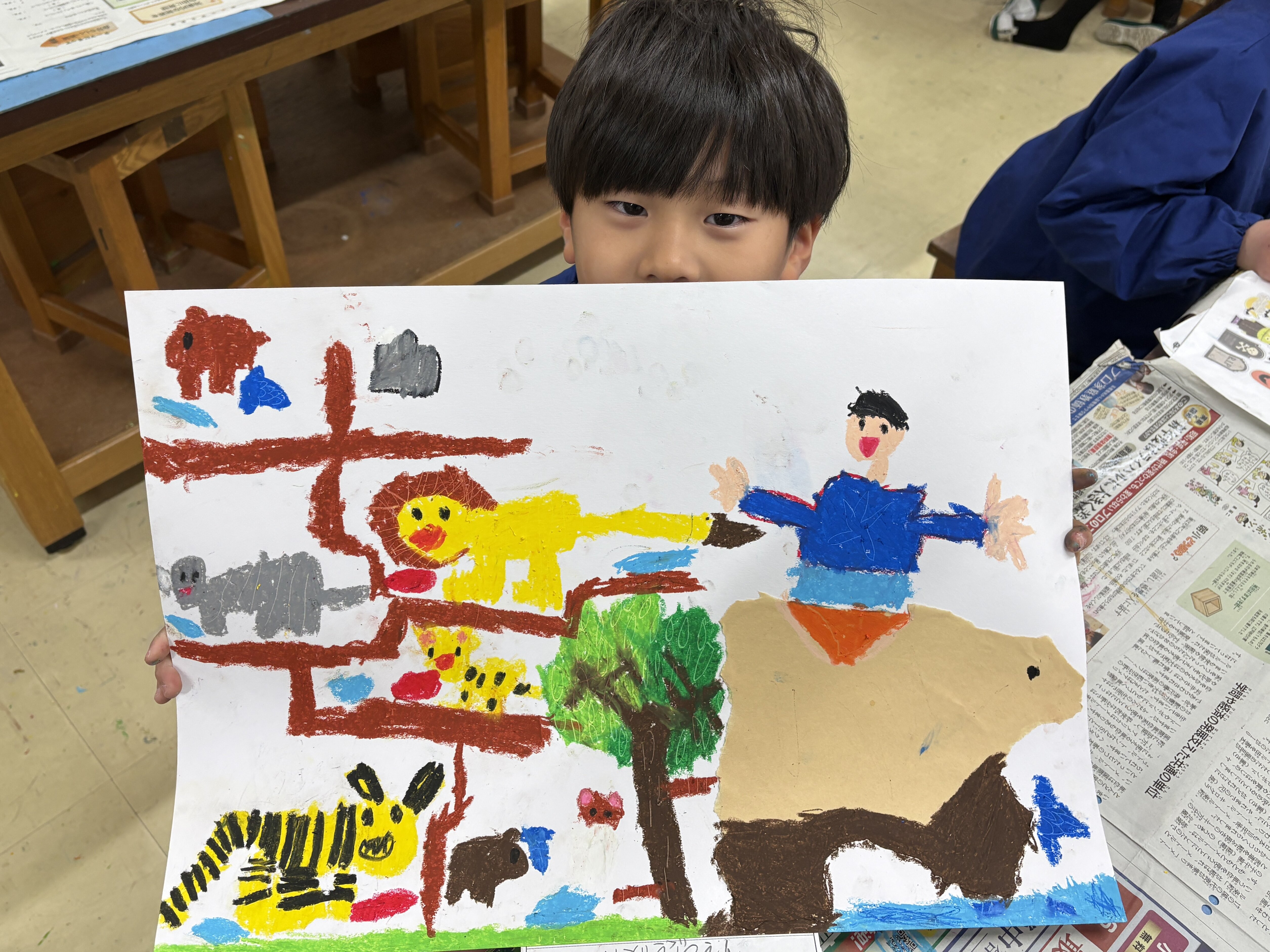 そして作った形を画用紙に貼り、クレパスで絵を描き足していきました。