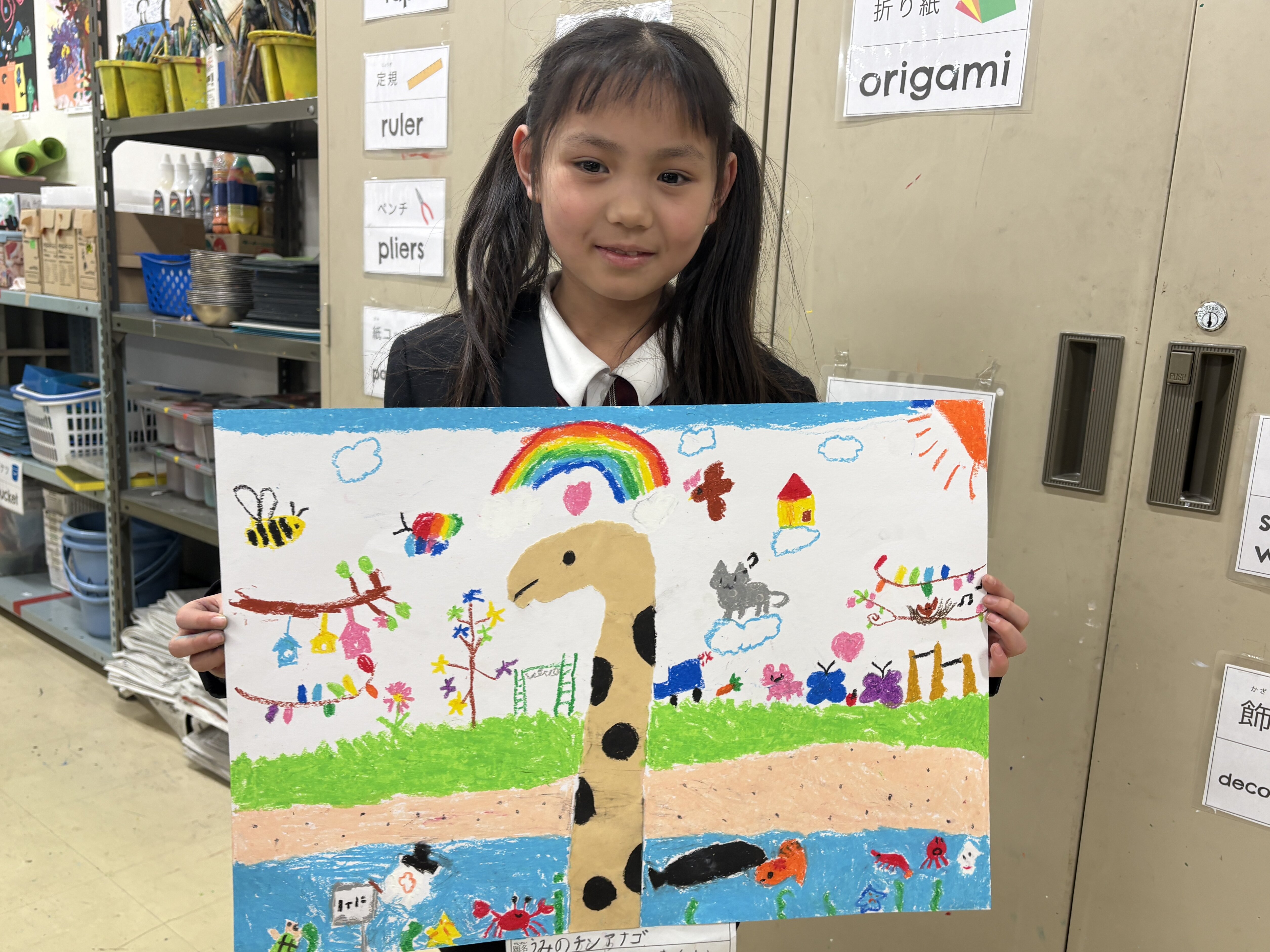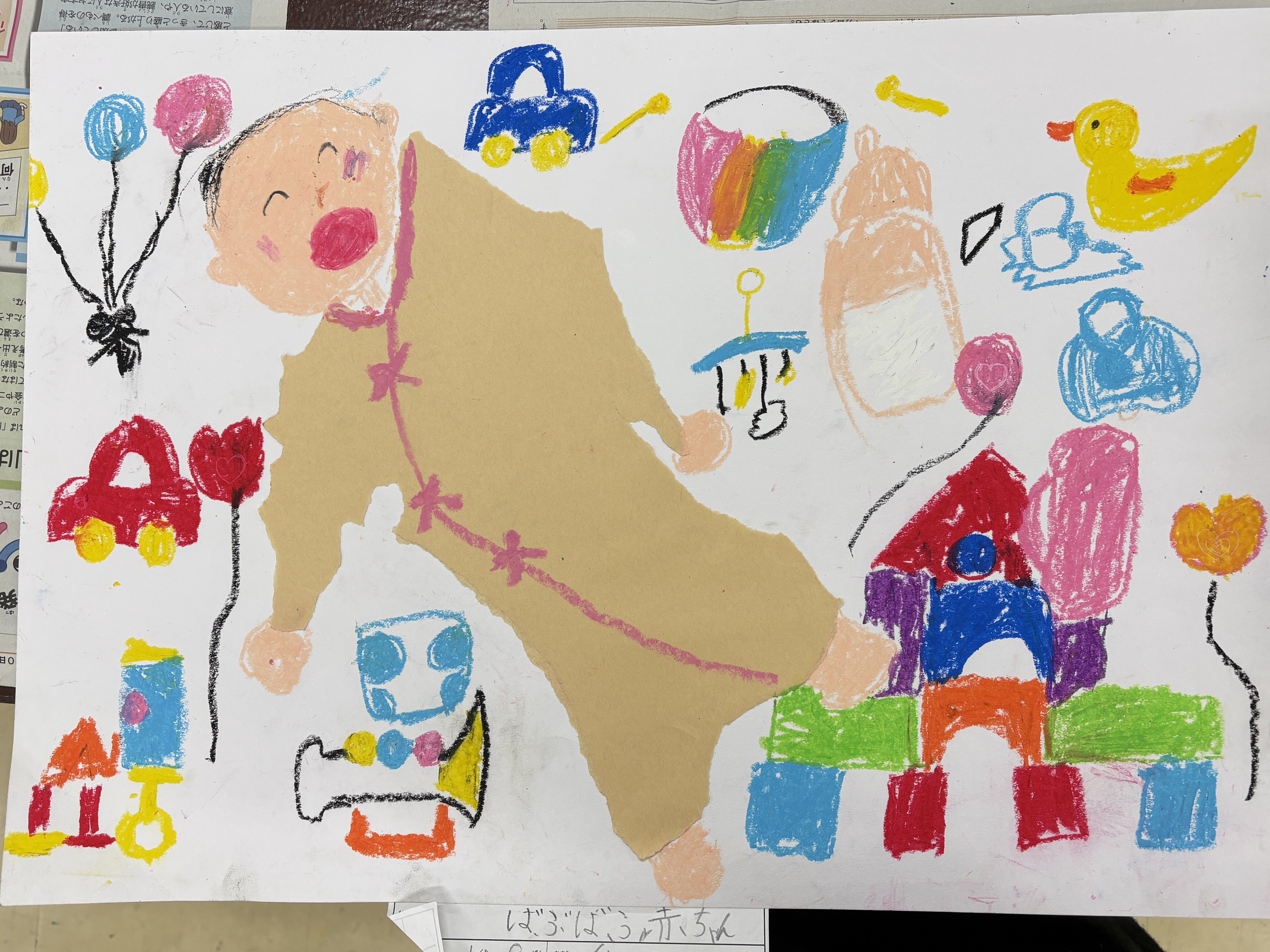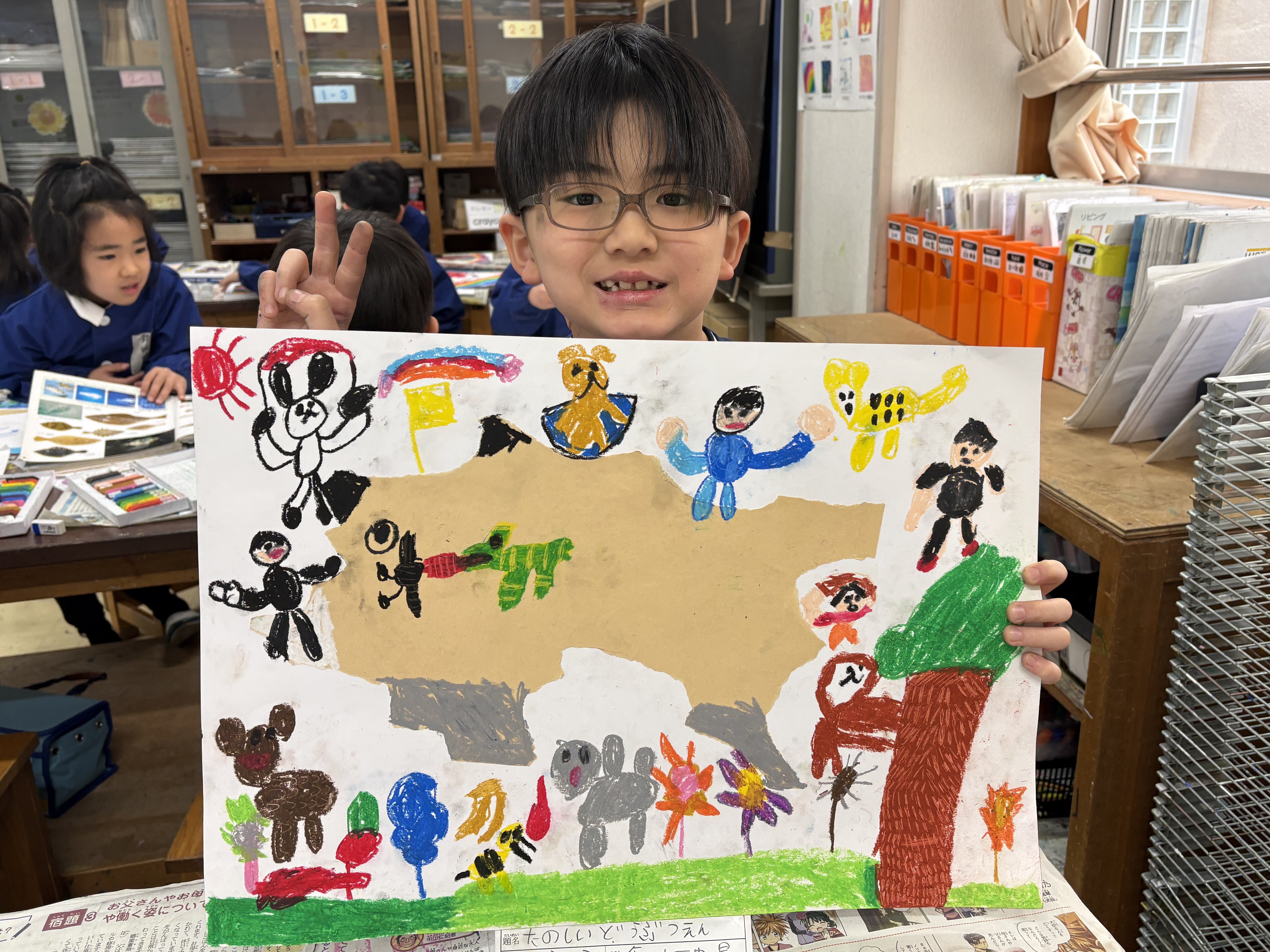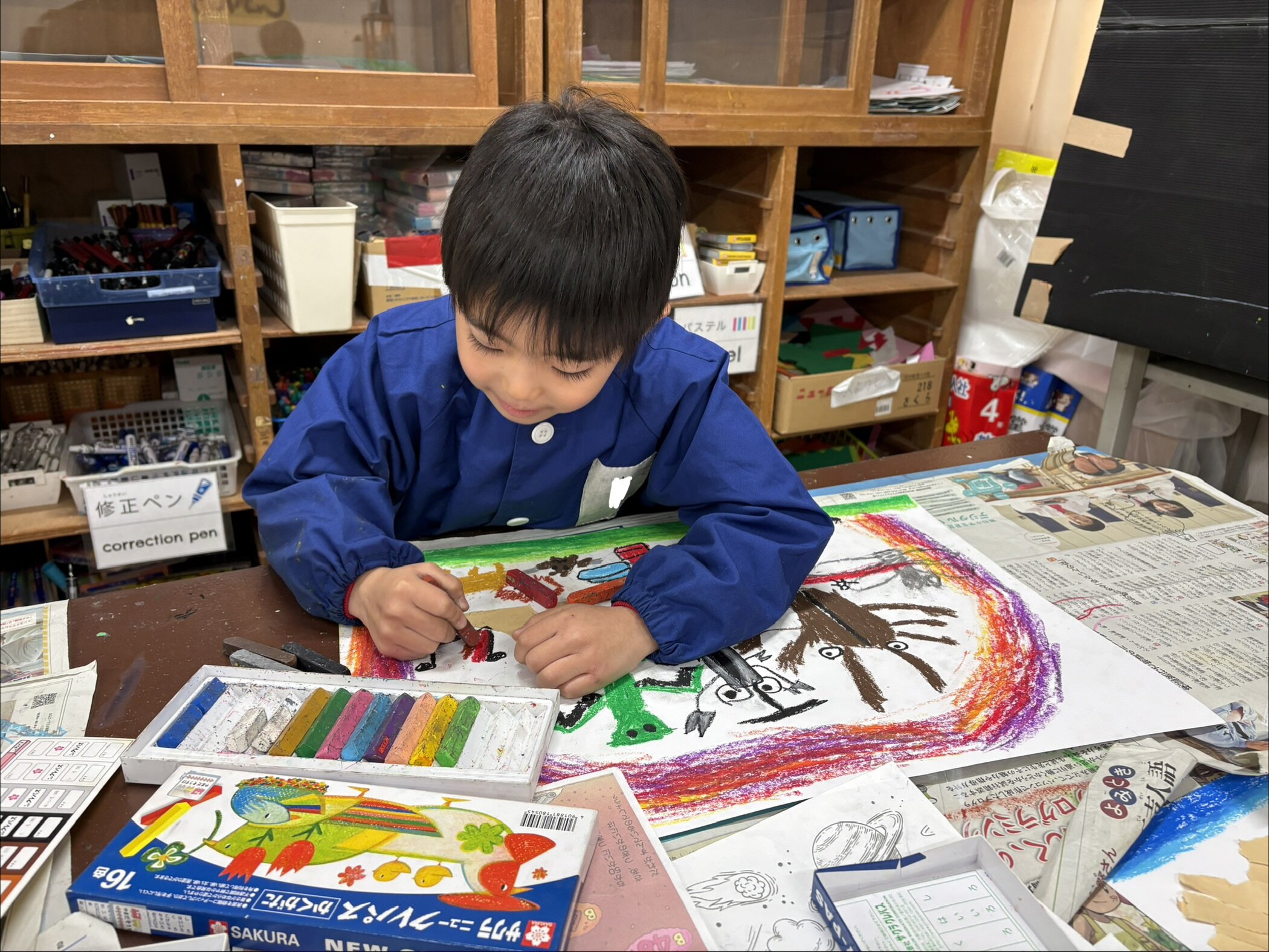 そして作った形を画用紙に貼り、クレパスで絵を描き足していきました。