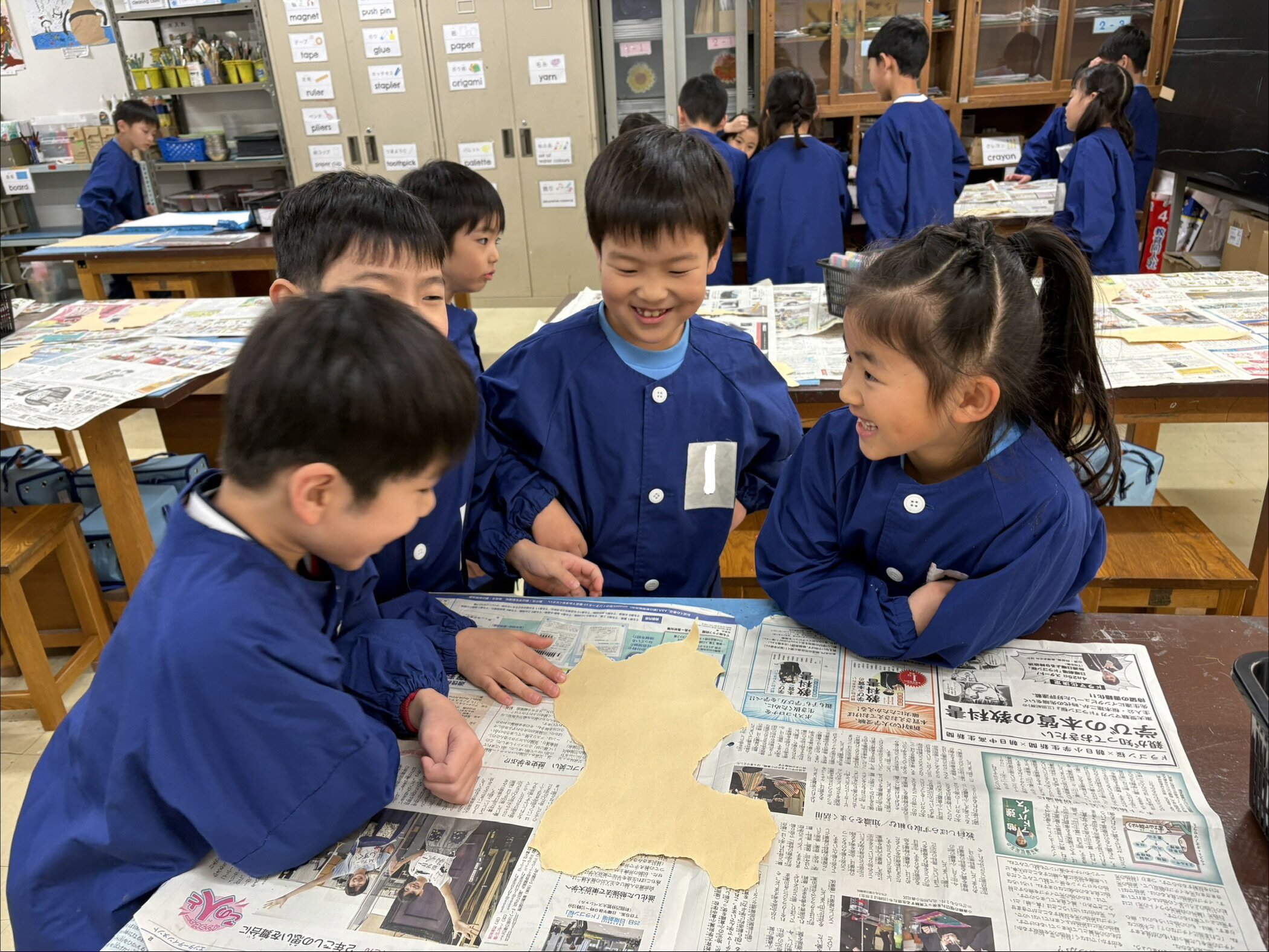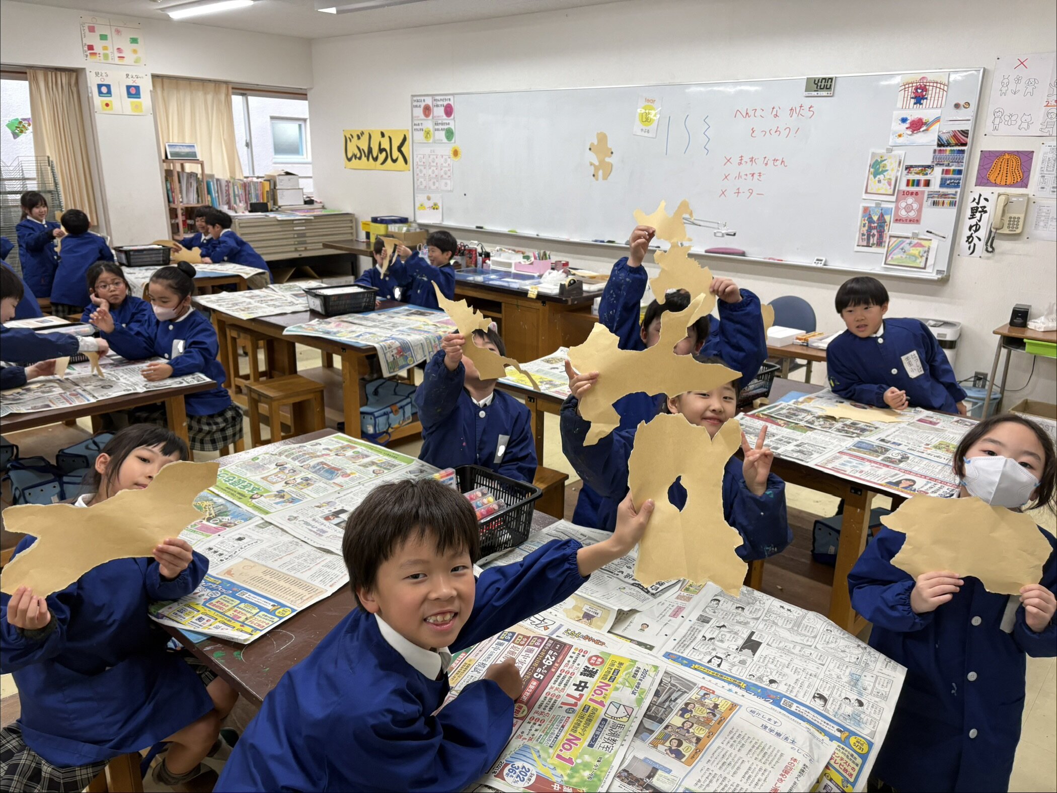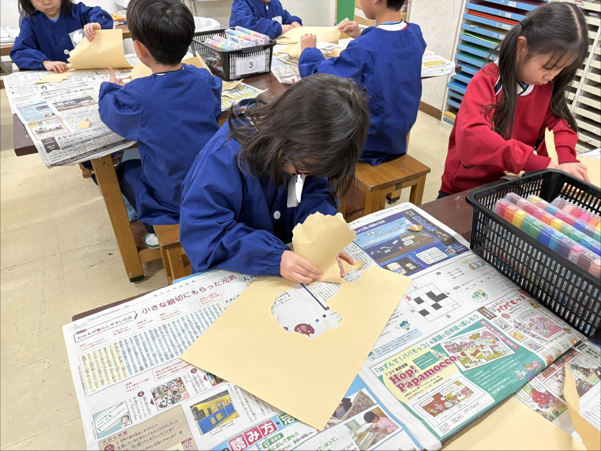 そして、クラフト紙をやぶいて「ヘンテコな形」をつくり、見立てを楽しみました。