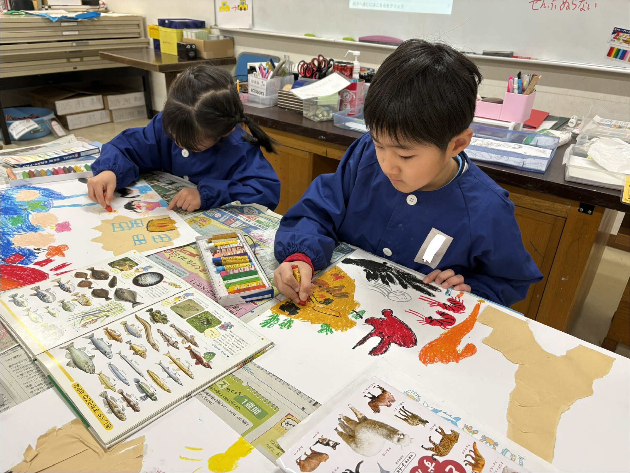 図鑑をじっくりみたり、ストーリーを考えながら自分の思い描く世界を表していきました。