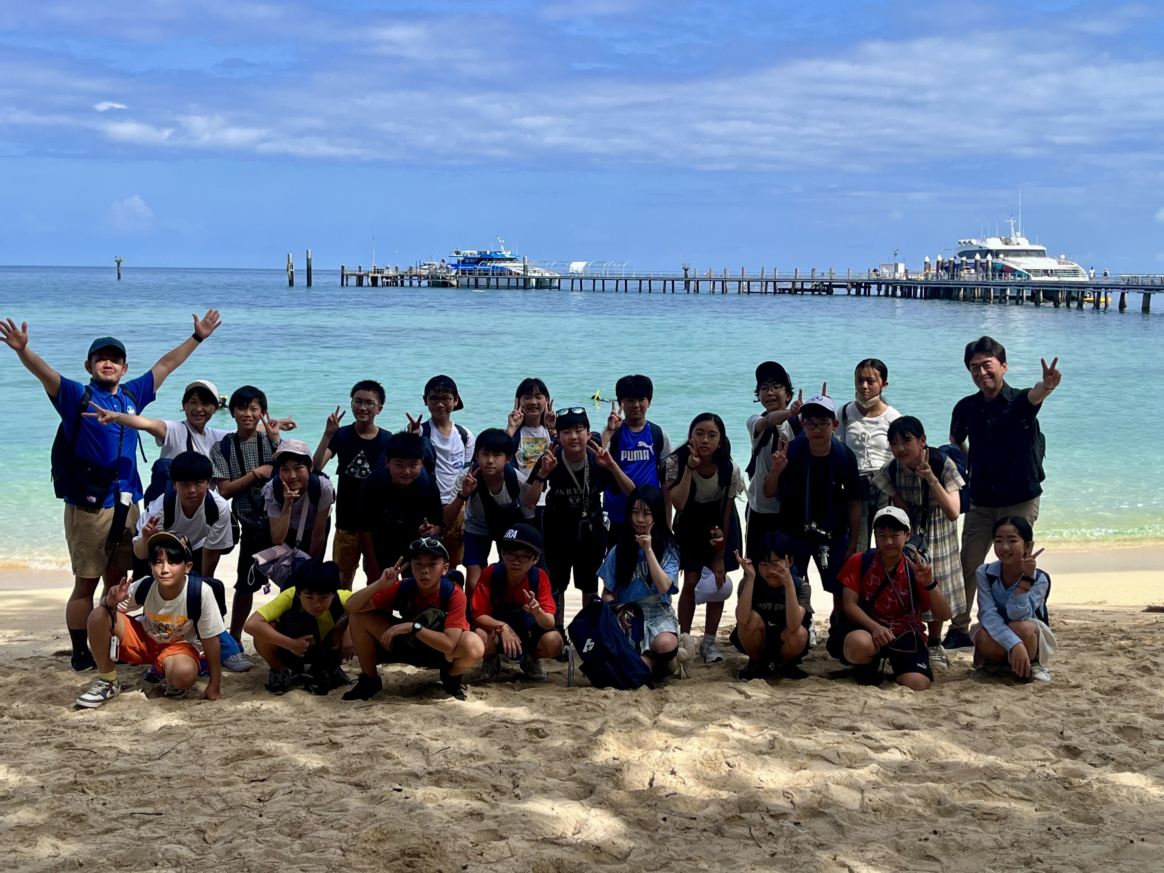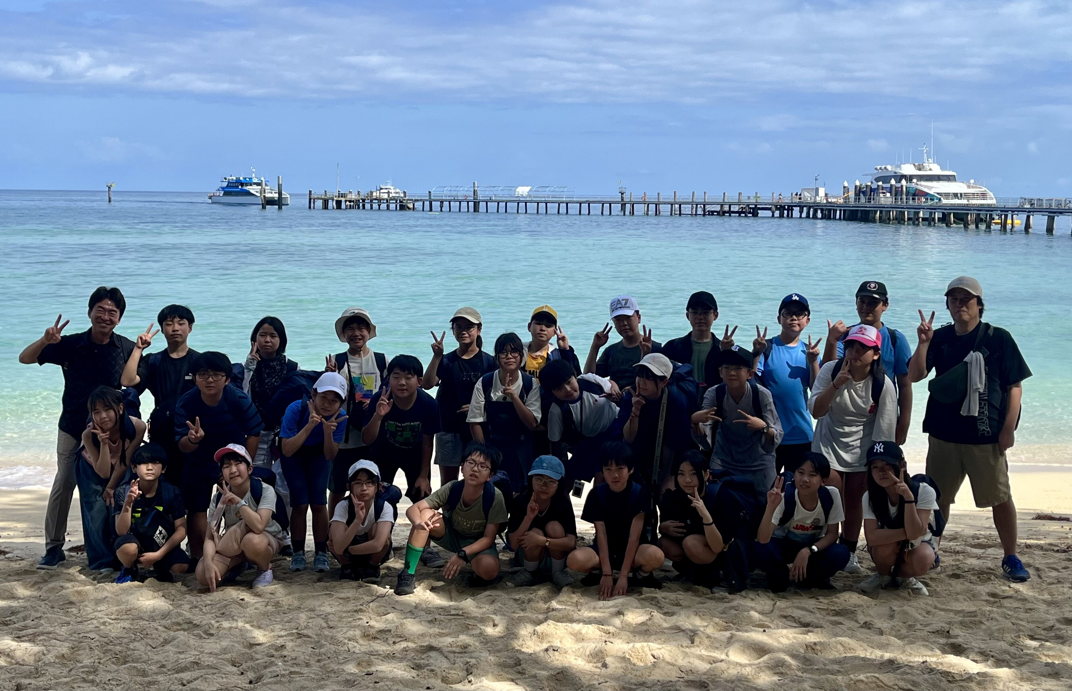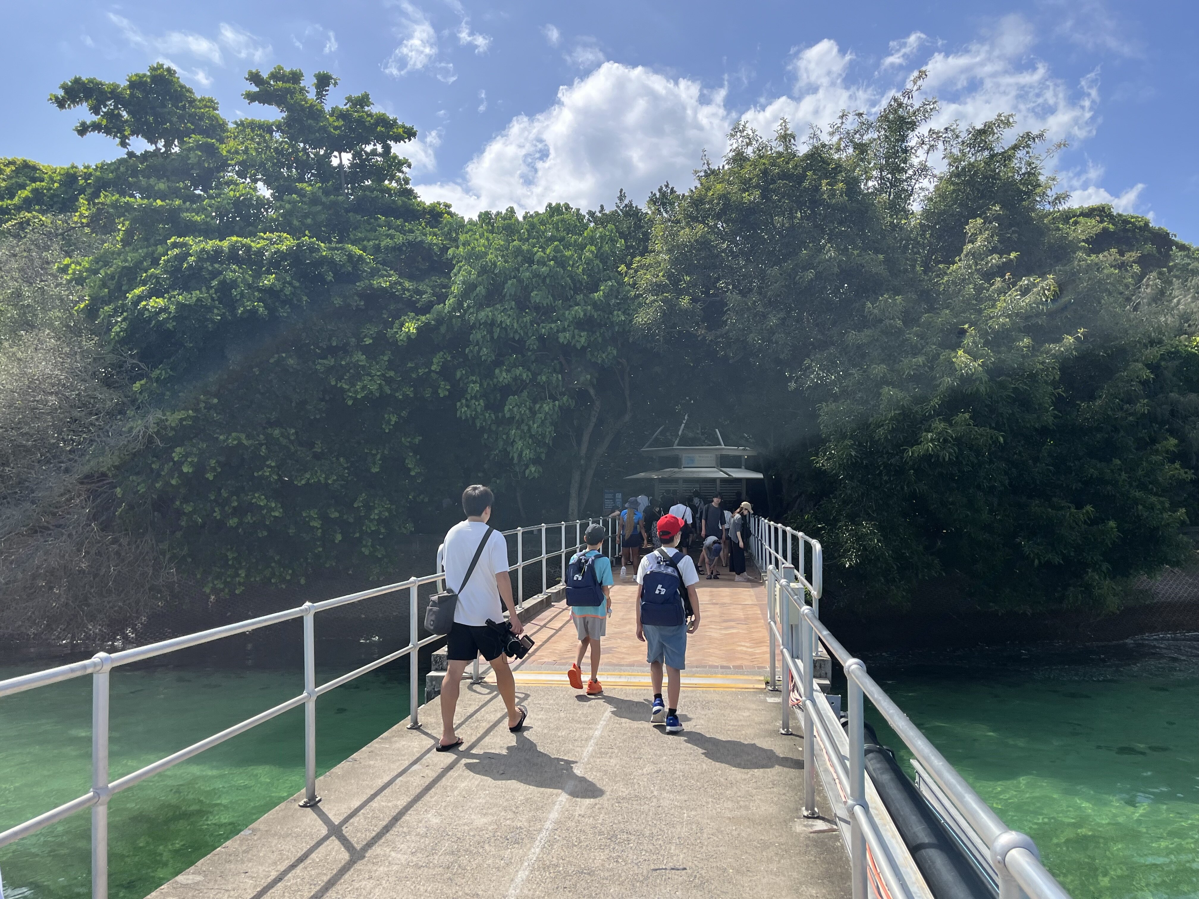 2026/02/125年 グリーン島上陸! いよいよグリーン島が見えてきました。 ケアンズにある世界遺産グレートバリアリーフの中で、サンゴ礁が堆積した砂の上に熱帯雨林が生い茂る唯一の島。 桟橋を渡り、いよいよグリーン島に上陸です。 グリーン島に上陸を果たした5年生の子どもたち。 今からケアンズ市内でお土産タイムに行ってきます。