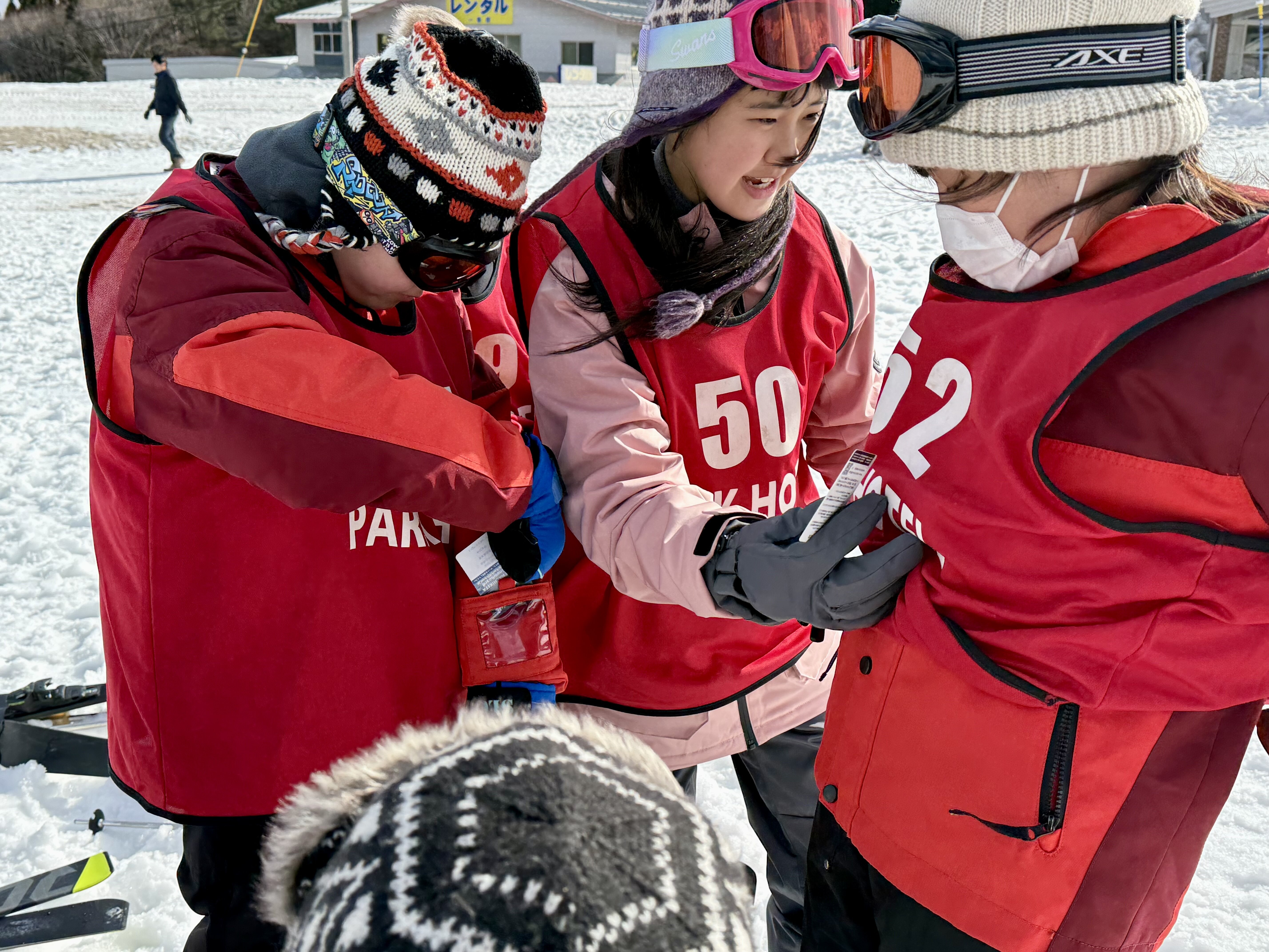 チームごとにゼッケンを配ってもらって切るのですが、強風でなかなか着ることができず、苦労しながらつけていました。