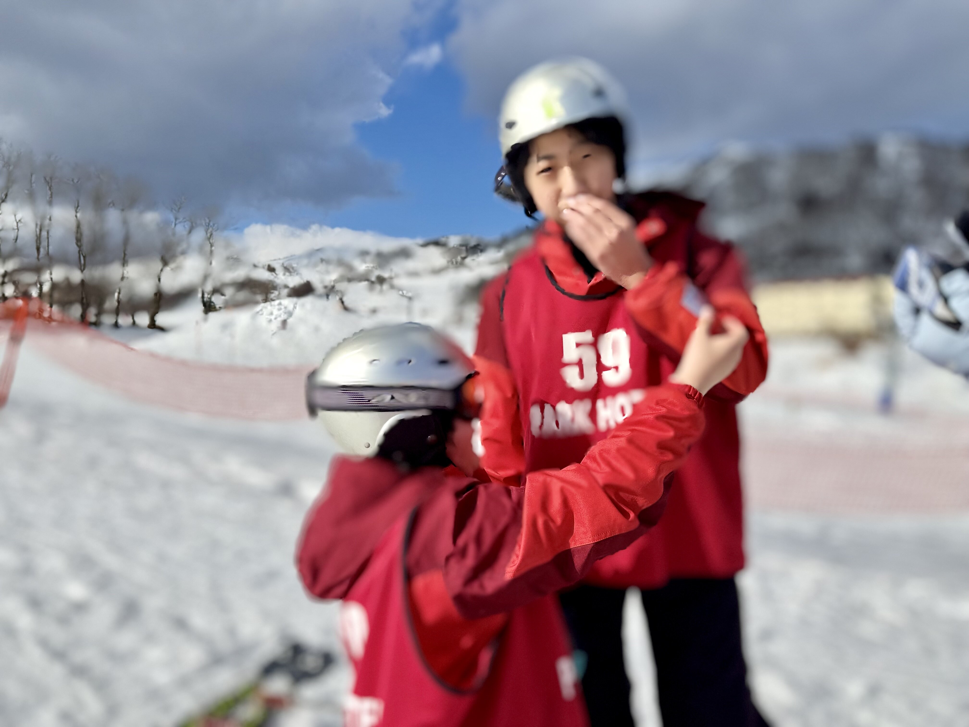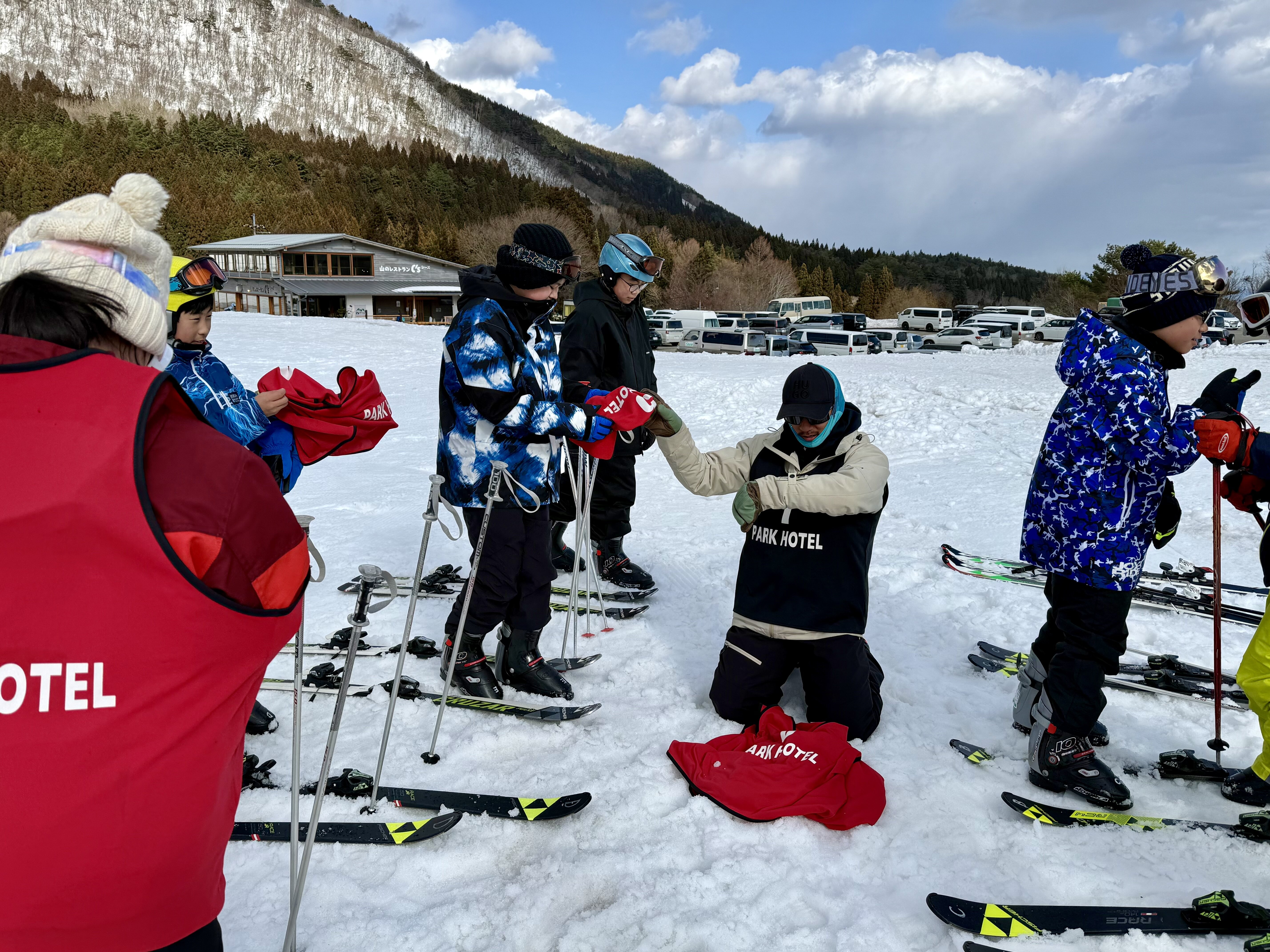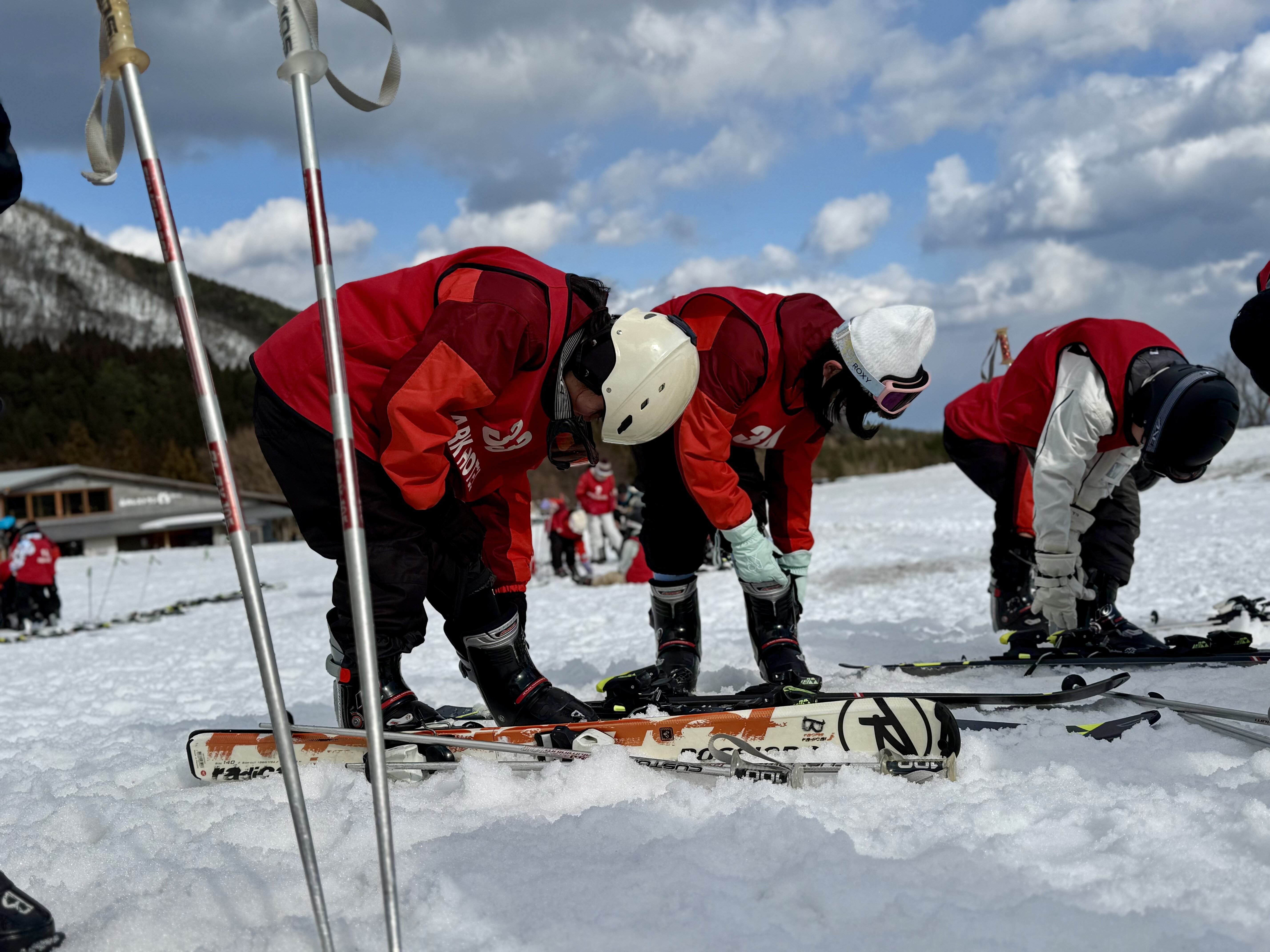 スキー靴の履き方を教えてくださいました。でも、初めてのスキー靴は硬くて悪戦苦闘している子どもたちでした。