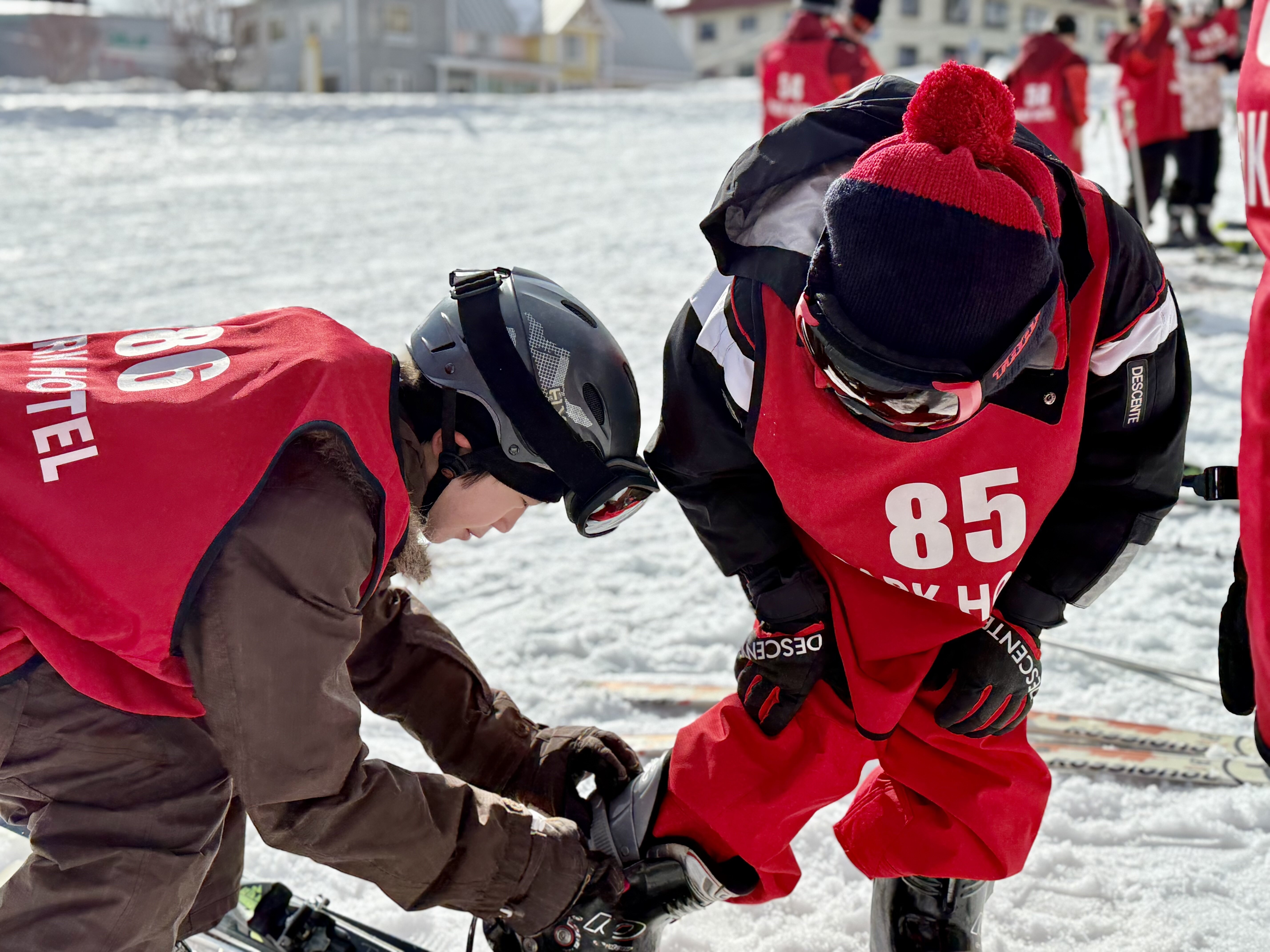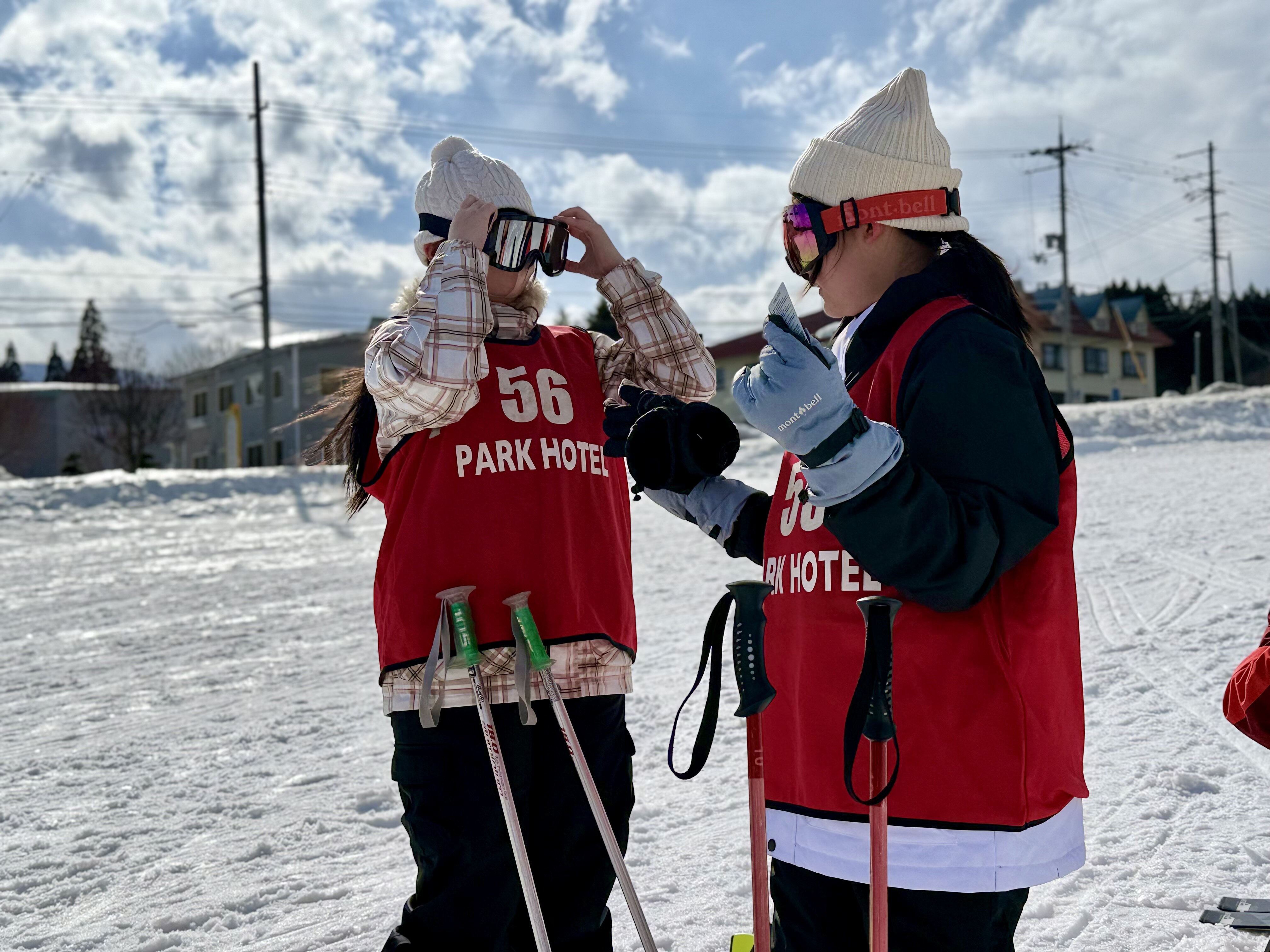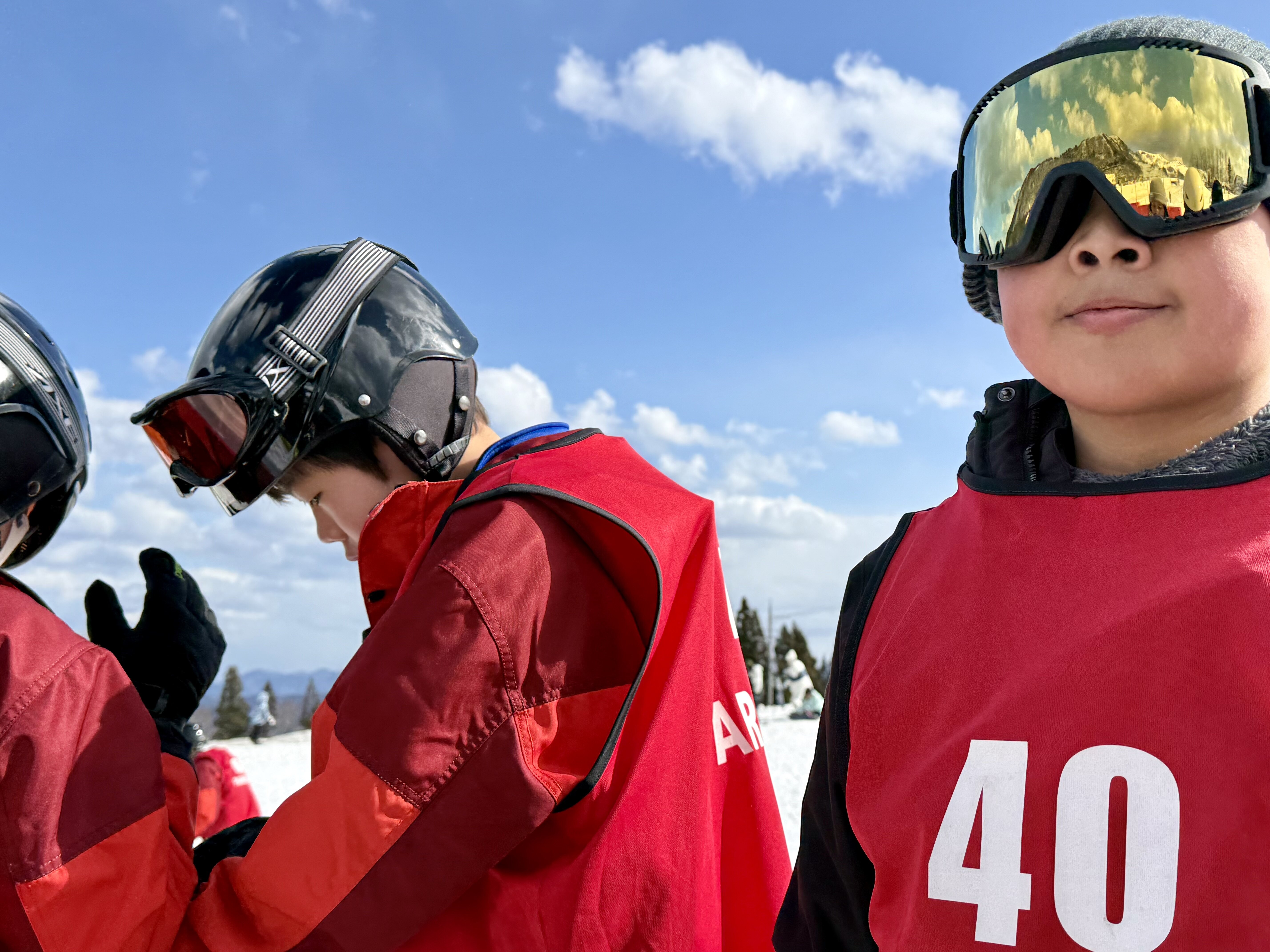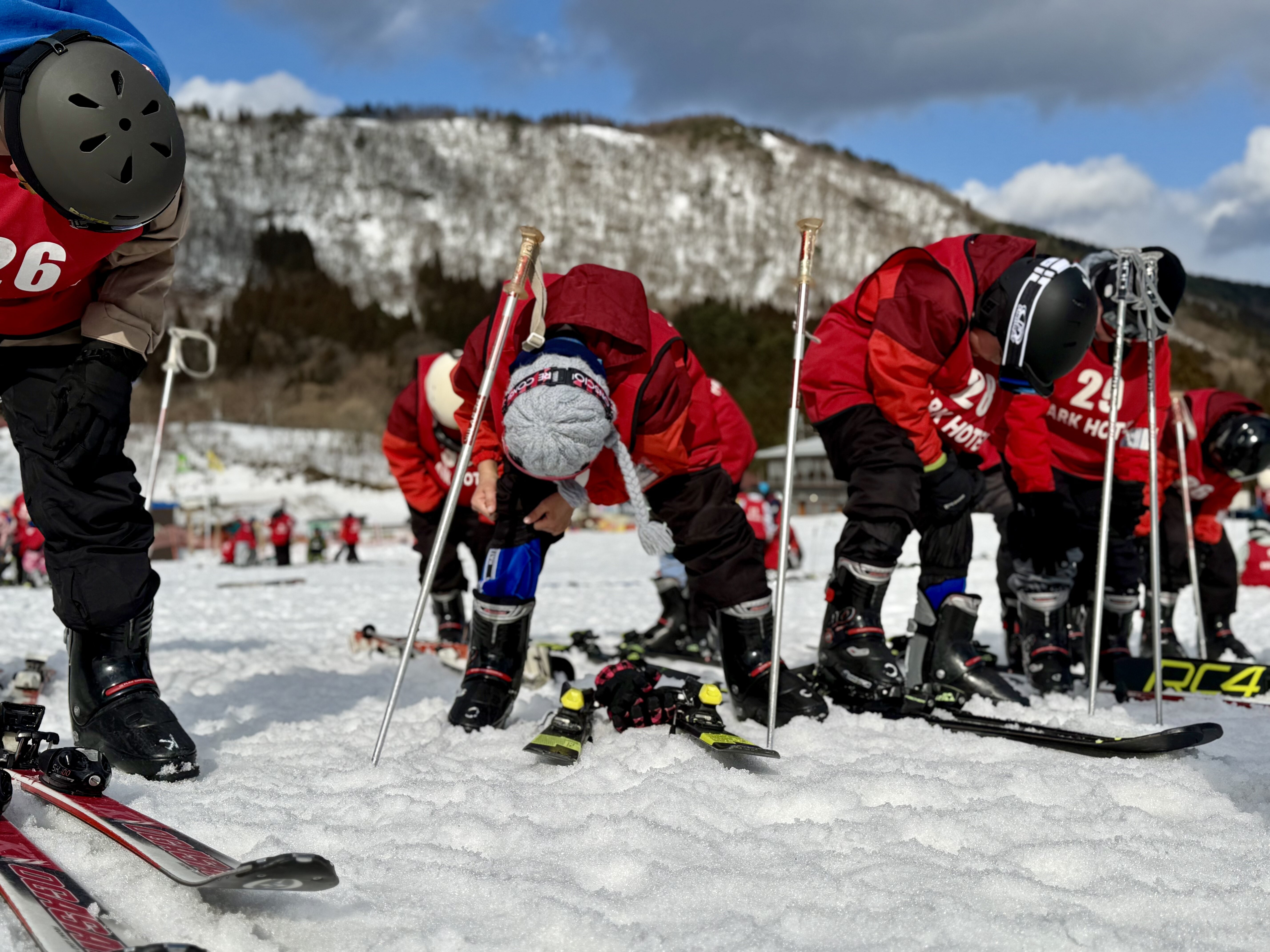 スキー靴の履き方を教えてくださいました。でも、初めてのスキー靴は硬くて悪戦苦闘している子どもたちでした。