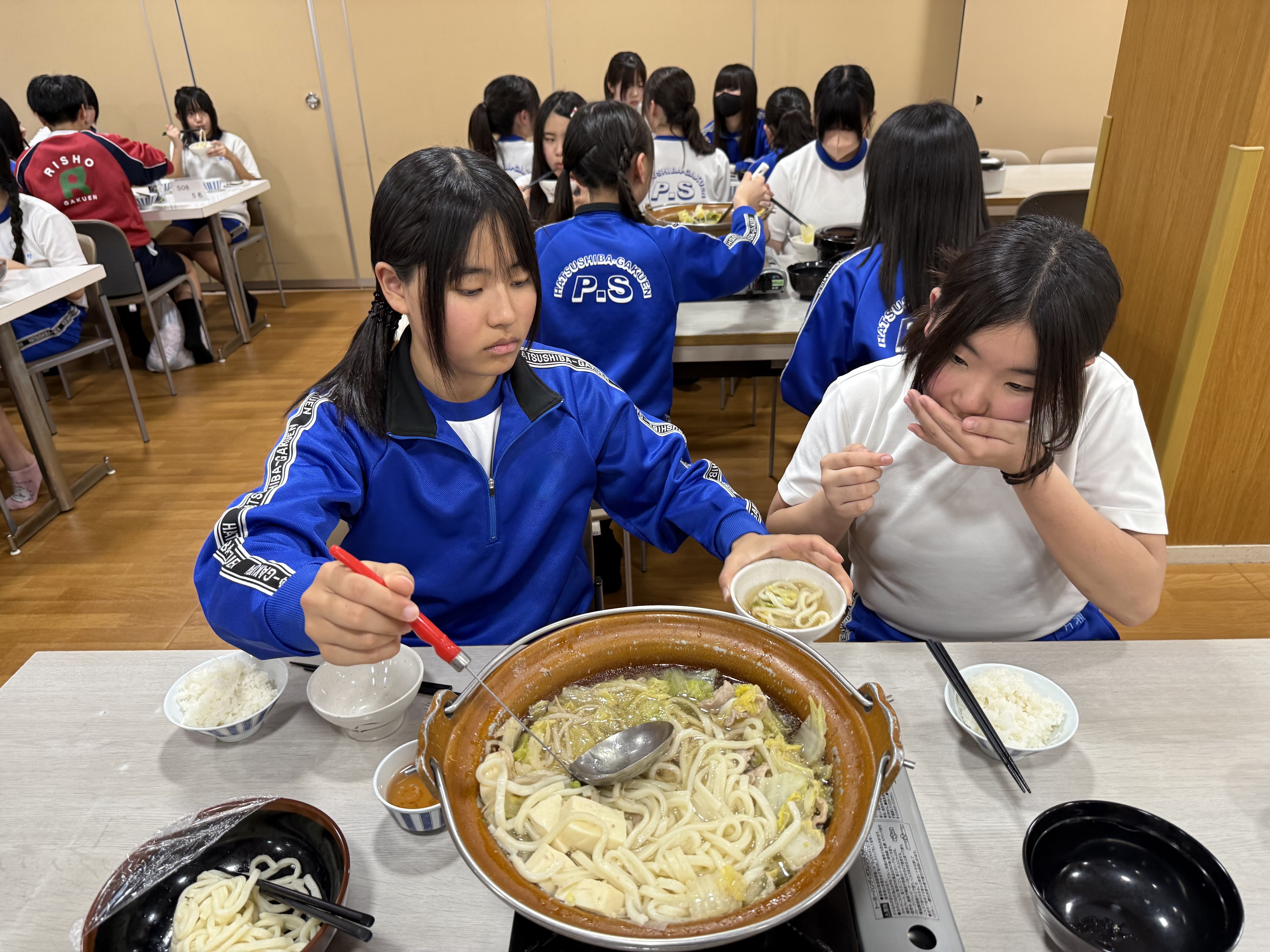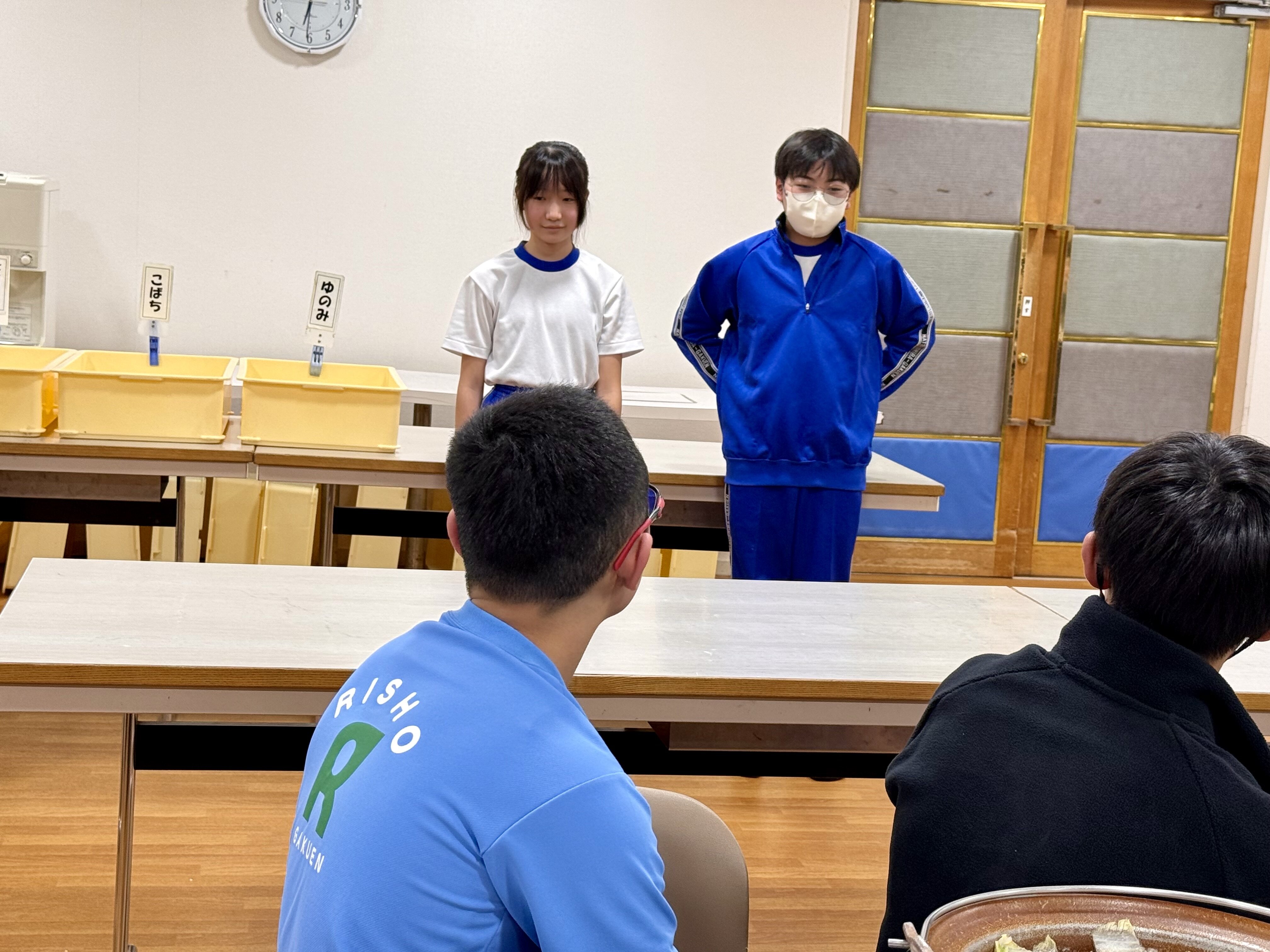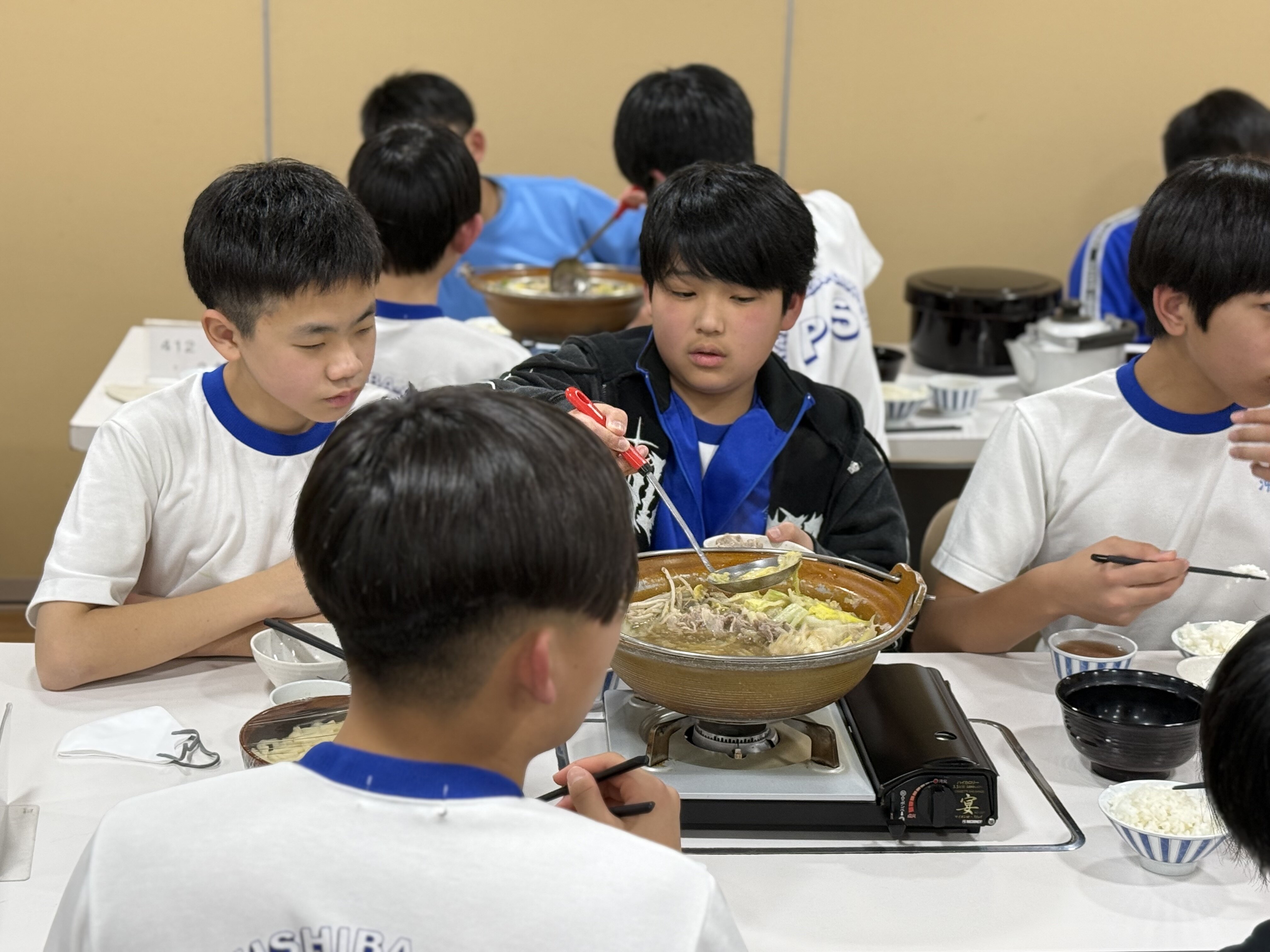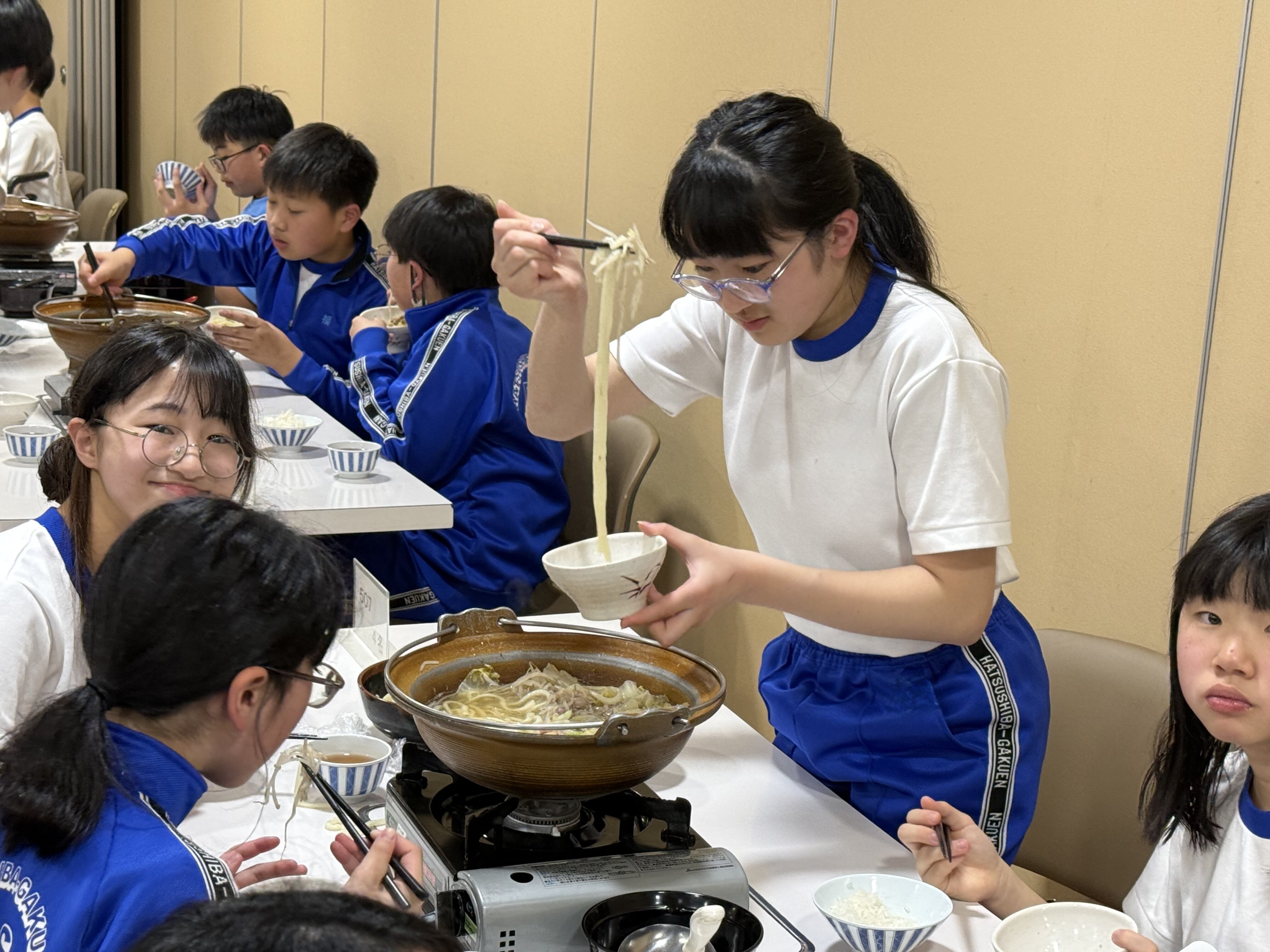 2026/02/186年 夕食 入浴後は、夕食の時間です。 担当の児童が挨拶をしてくれました。 夕食はお鍋です。締めはうどんです。火傷しないように部屋のメンバーで仲良く分けて食べました。 スキー講習を頑張って、お腹がすいたのかしっかり食べていました。