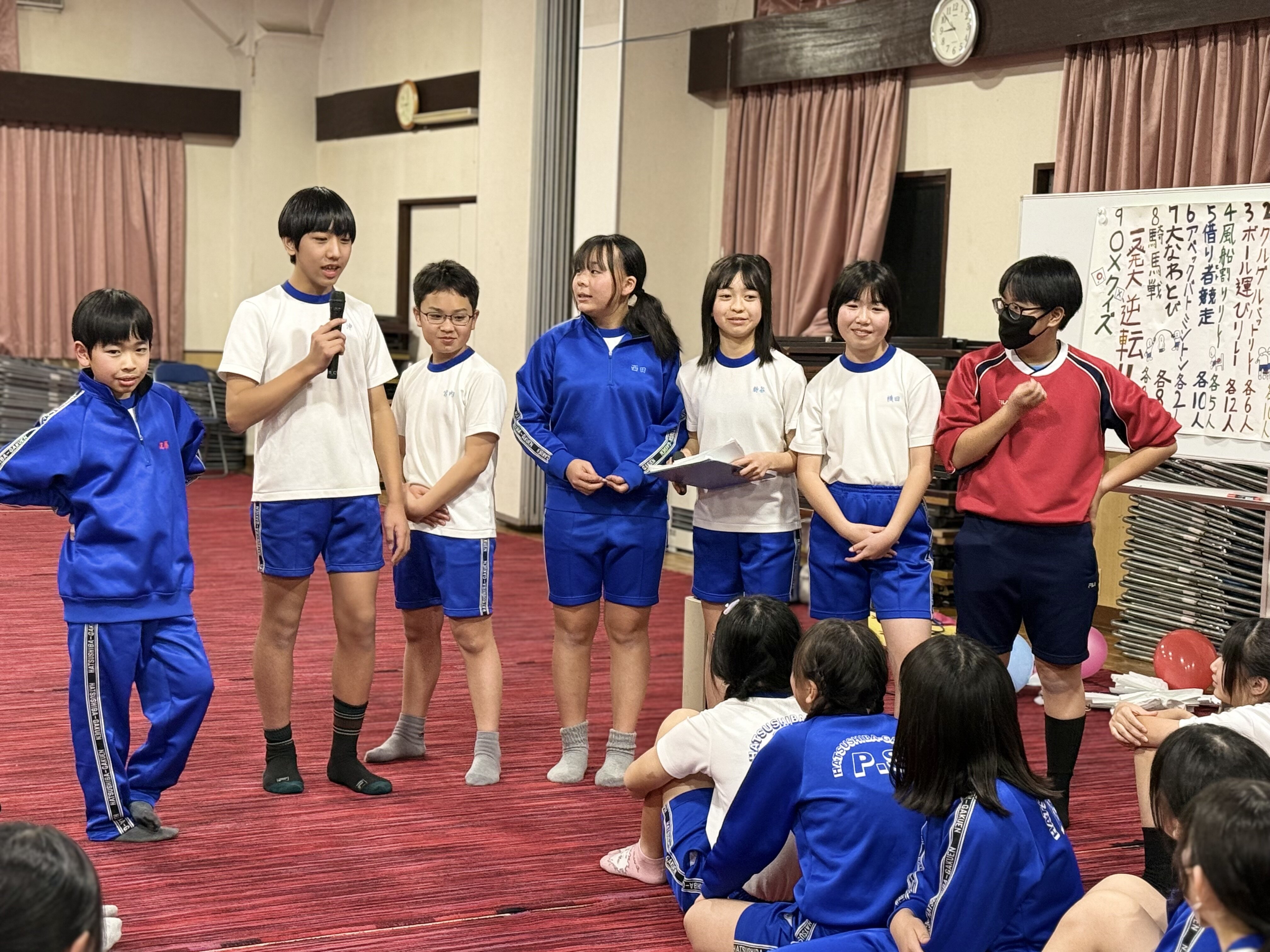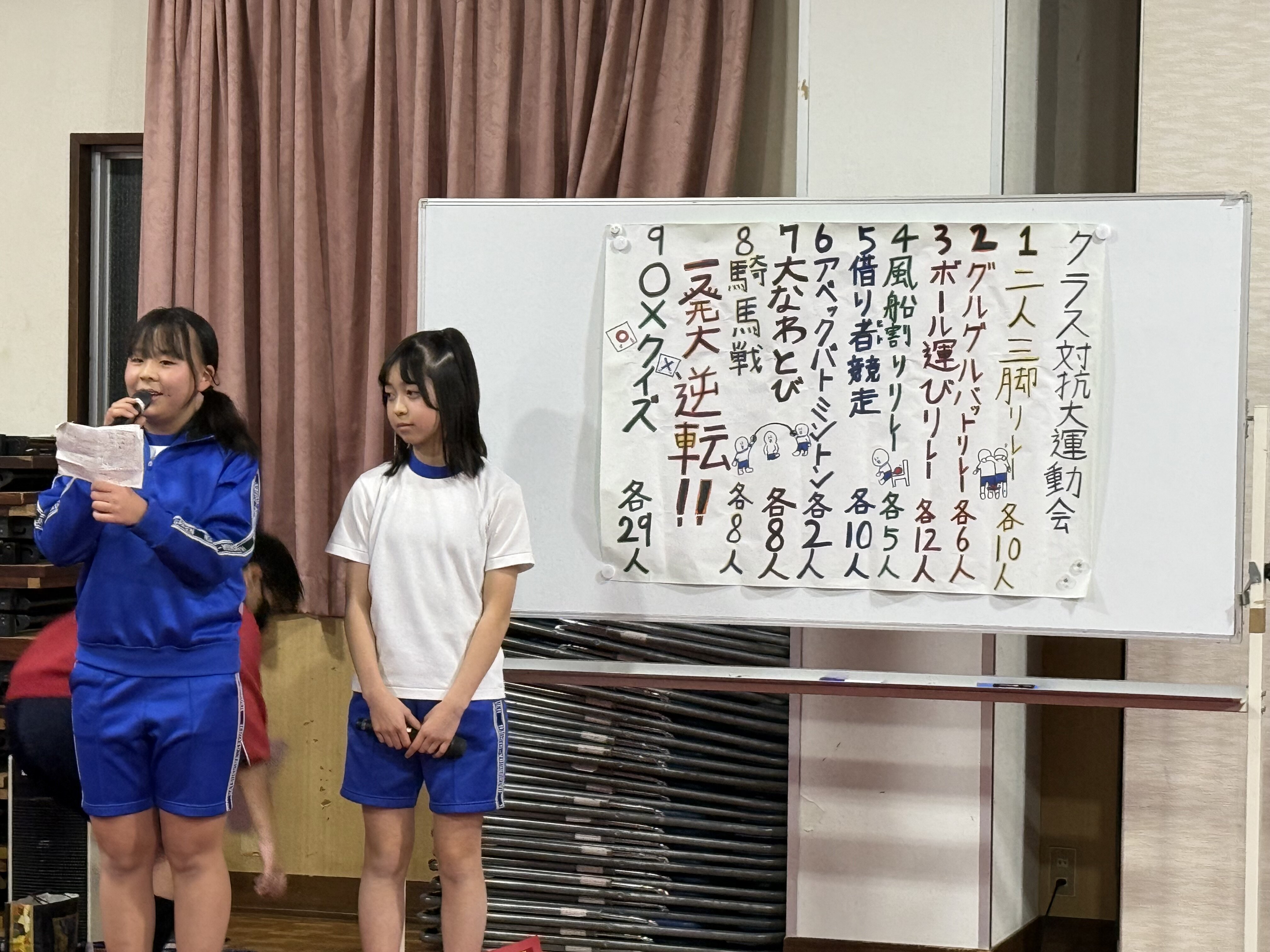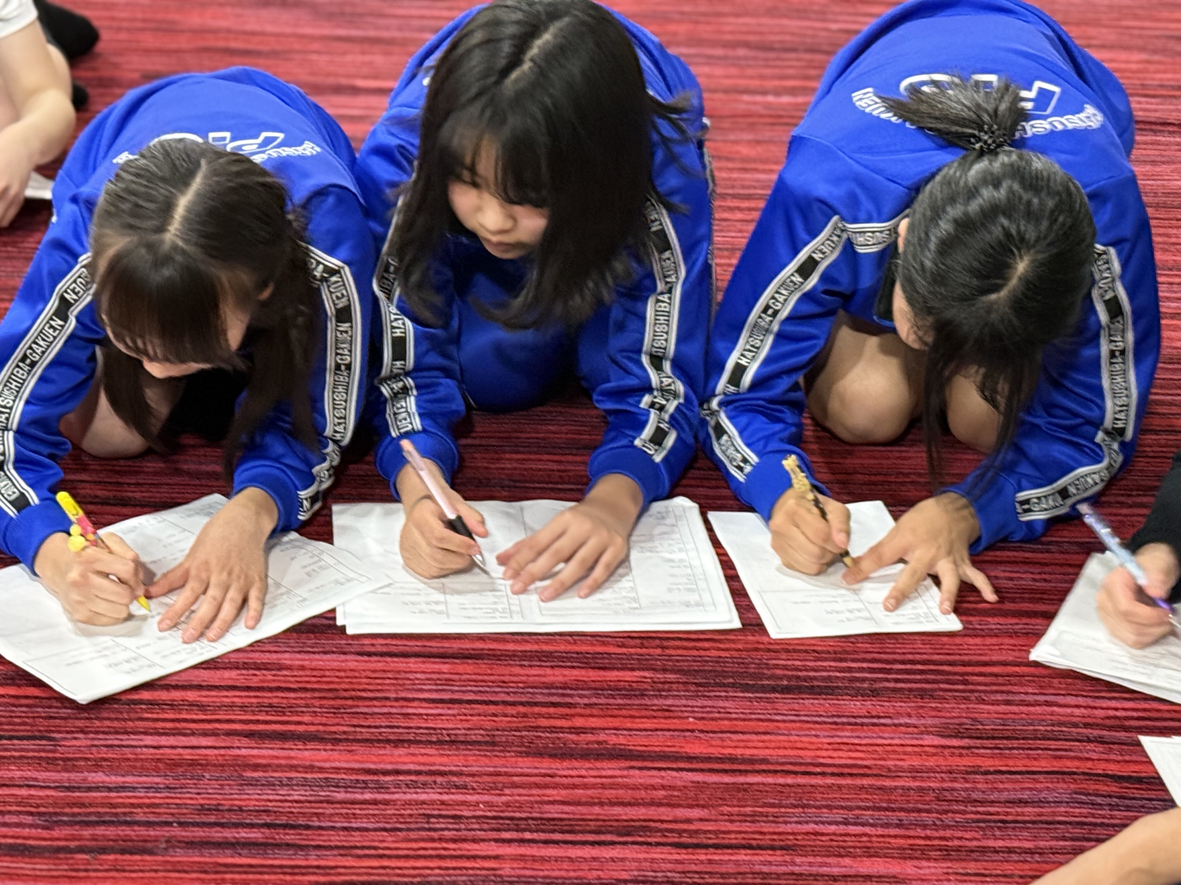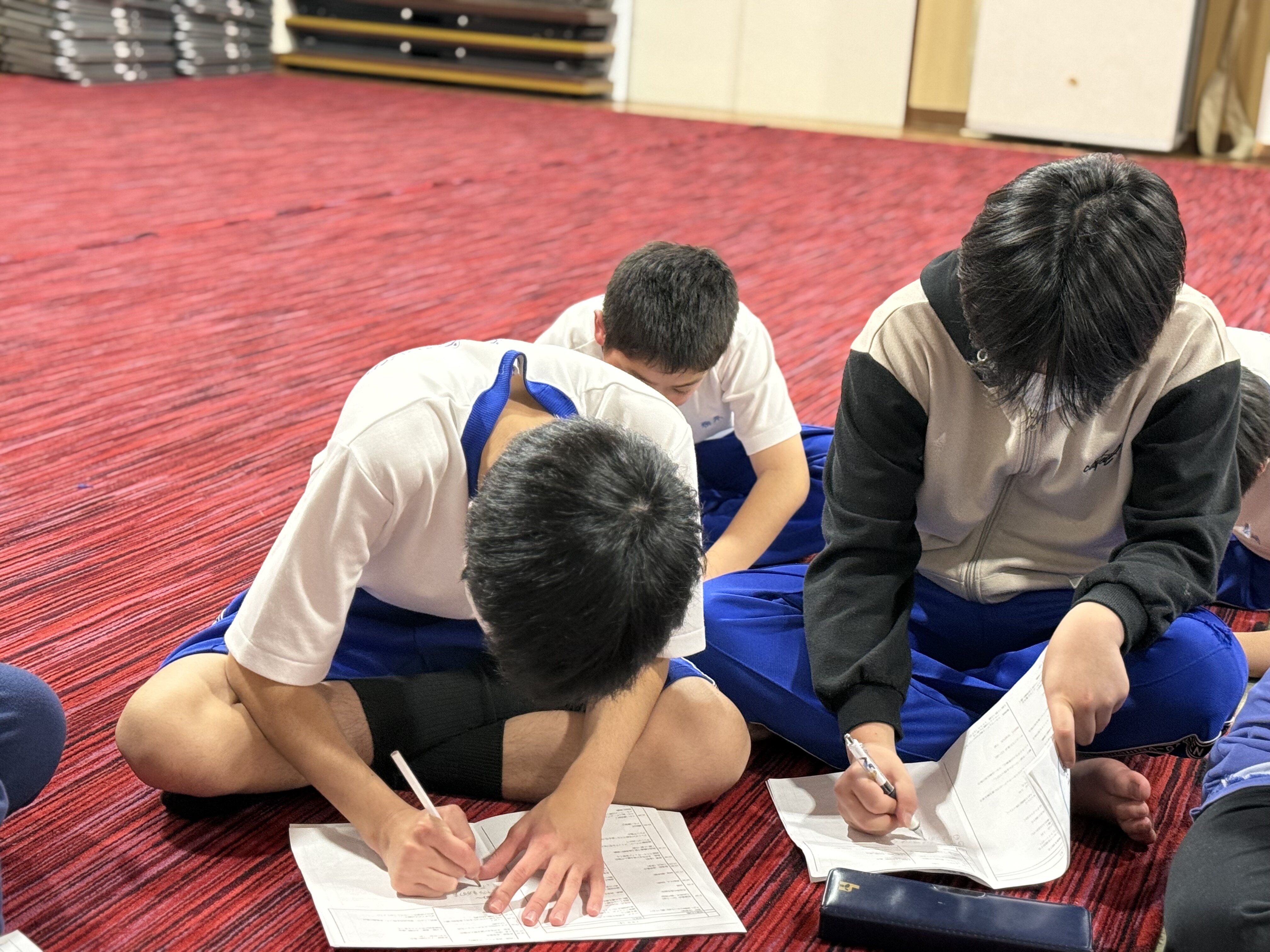 2026/02/186年 クラス対抗レクリエーション大会 レク係がたくさんの種目を考え、準備してくれました。 一種目ごとに点数化されるので子どもたちも大盛り上がりでした。 各クラスの最終得点です。3組が逆転優勝で幕を閉じました。 レク係のみなさん、楽しいイベントを企画してくれてありがとう。 レクリエーション終了後は、班長会議です。各班長は、今日の反省と明日の連絡事項をしっかり書き留めて部屋で待っている班のメンバーに伝えます。