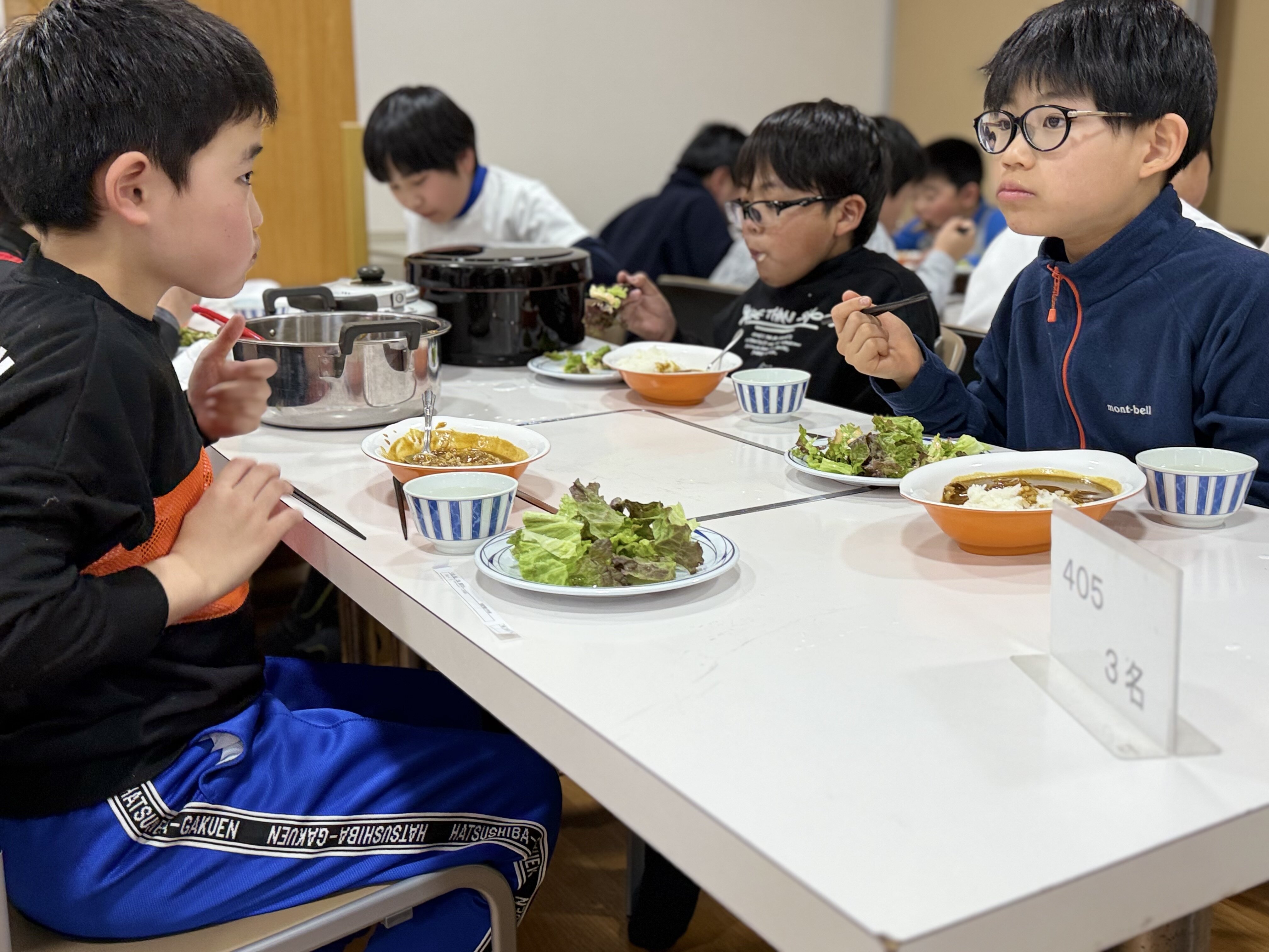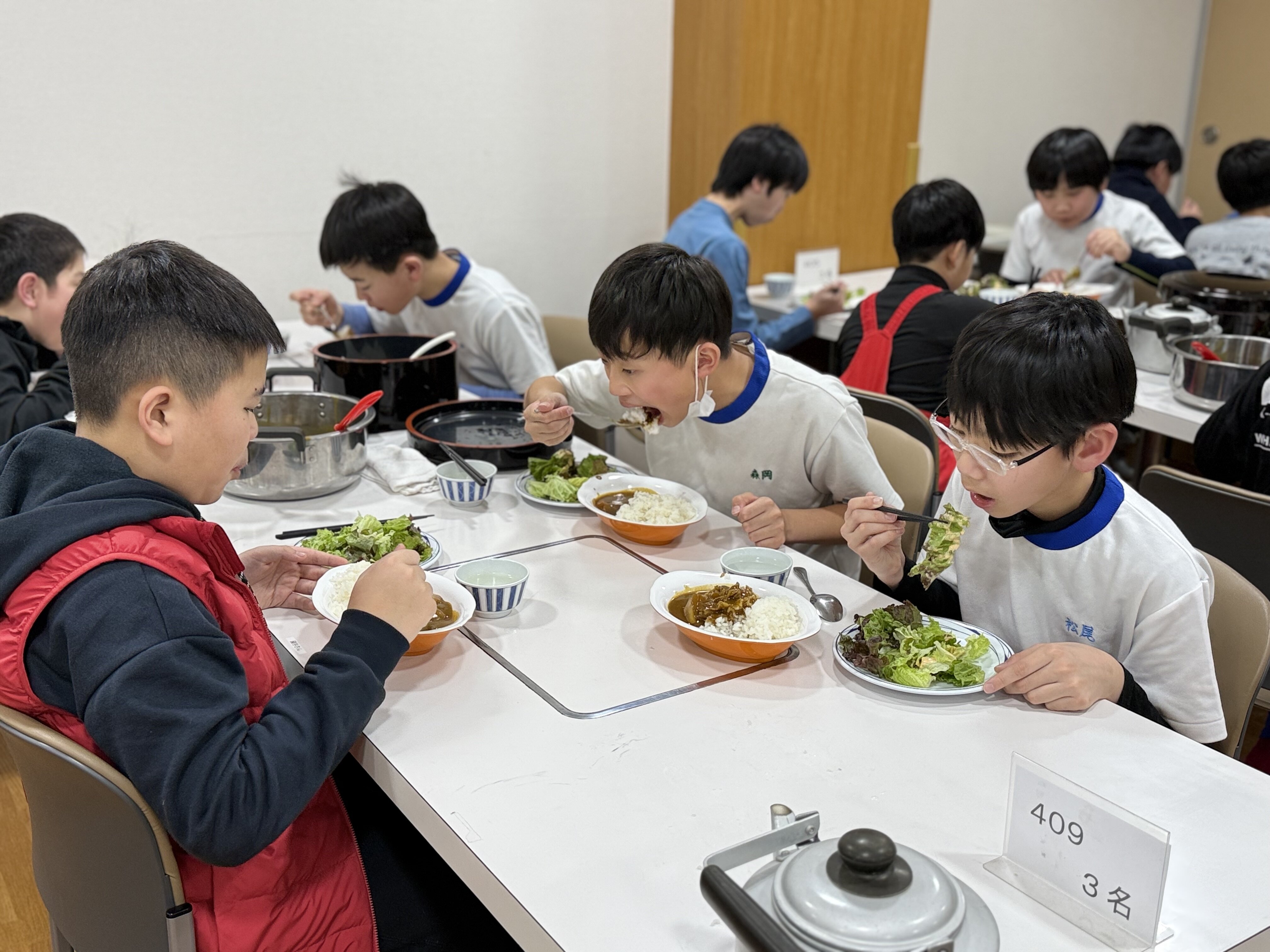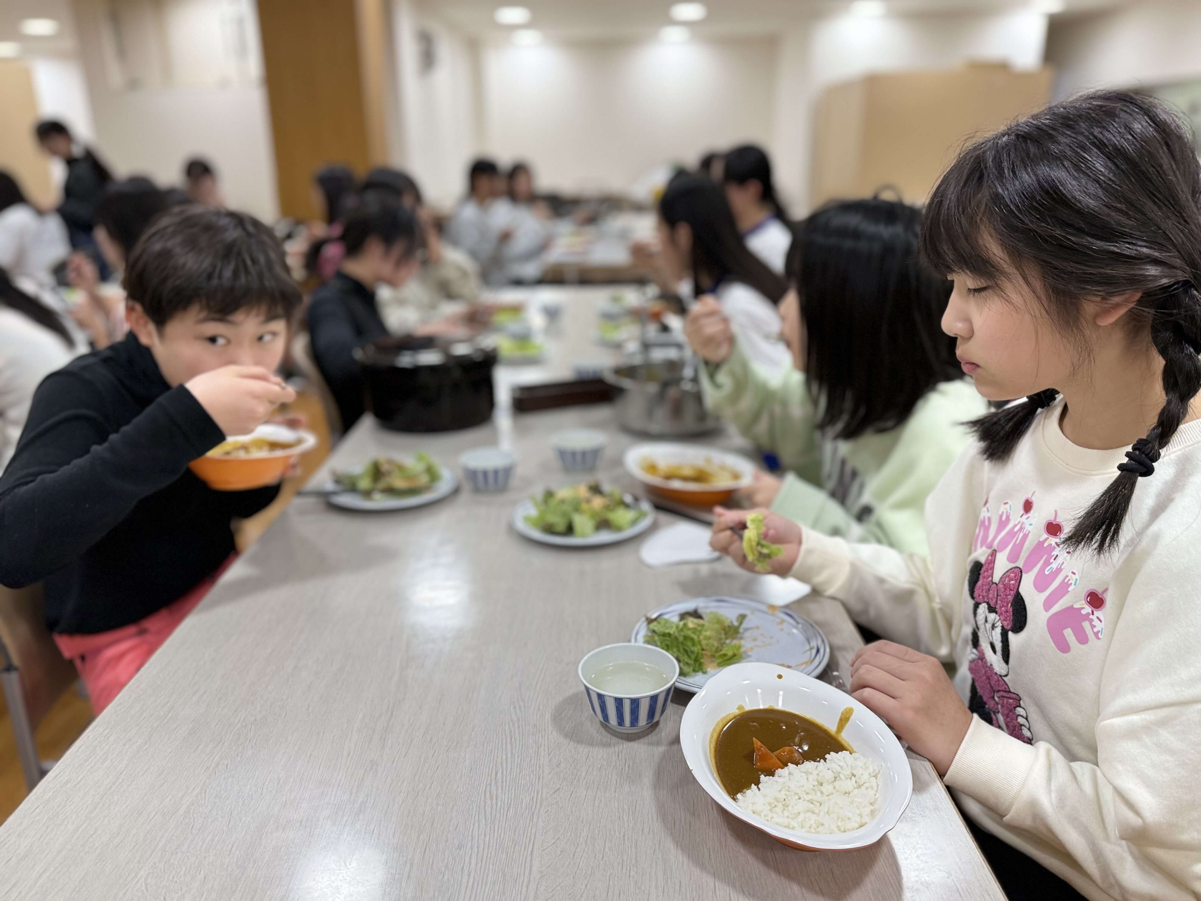 2026/02/196年 昼食 今日の昼食は、カレーライスです。 子どもたちが大好きなメニューだし、お腹も空いているので、あったいう間にお鍋を空にしていました。前に何度もお鍋やお櫃を持っておかわりにきていました。 午後からのスキー講習も頑張ろうね。