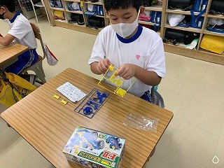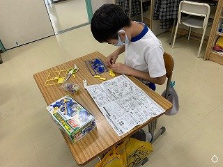 2020/09/174年 理科の授業〈4年生〉 理科の授業で、モーターカーのキットを使い、電気の働きについて学習を行いました。 「できたー!!」「動いたー!!」という声がたくさんあがっていました。 一つ間違えると動かない難しい作業も、みんなしっかりと先生の話を聞き、一つずつ丁寧に仕上げていました。 中には、プロペラから豆電球に変えて明かりをつける子もいて、楽しそうに電気の働きについて学習できました。